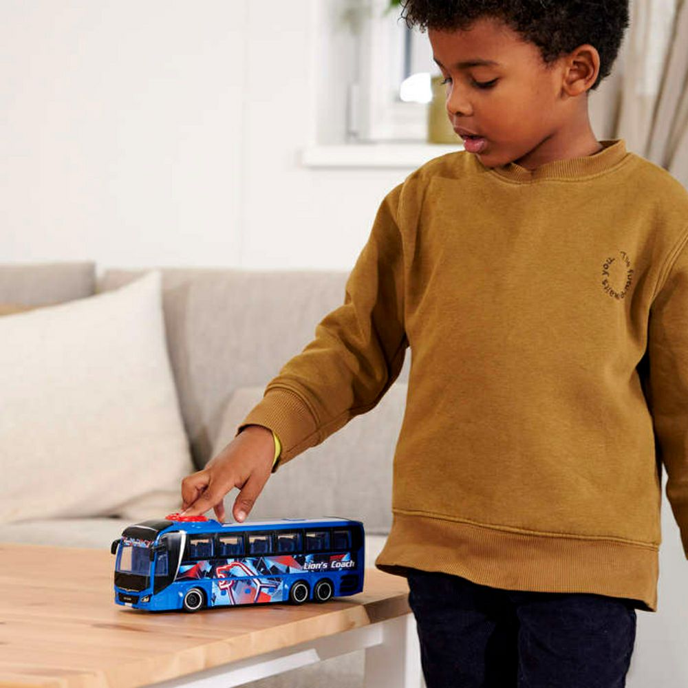 Одете на возбудливо патување со MAN Lion's Coach од Dickie Toys! Автобусите се удобен и удобен начин за патување. Изработен според оригиналното возило, овој автобус со играчки е официјално лиценциран од MAN и е полн со забавни функции и функции за да се забавува вашето малечко. Автобусот е опремен со вртливи тркала и вградена функција за управување со која може да се управува со вртливото тркало на покривот. Вратите и багажниот простор може да се отворат, што освен што ја открива сложената внатрешност, помага и да се поттикне имагинацијата на детето и да се обучат фината моторика. Должина на автобус 27 см. Возраст 3+