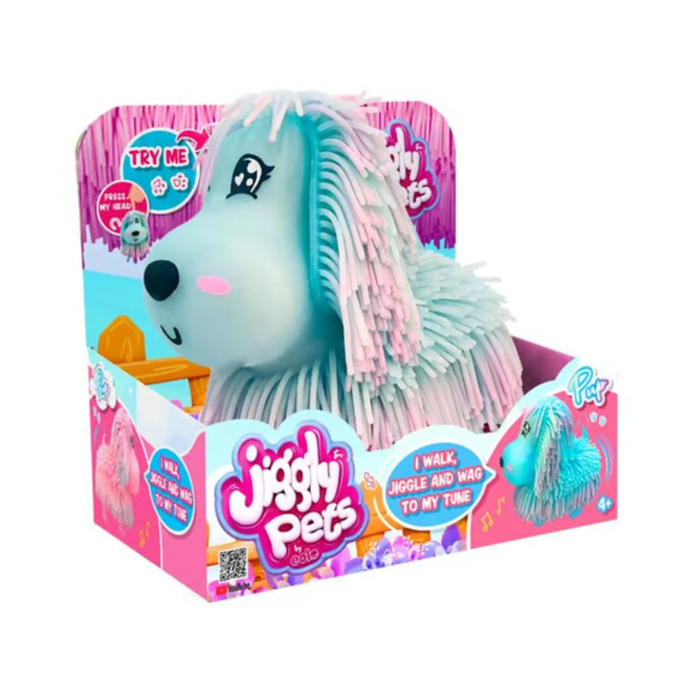 - Мекото кученце Jiggly Pets оди, танцува, тресе и ги мрда ушите и опашката во ритамот на мелодијата. Подгответе се да танцувате со вашето ново милениче и да уживате во часови прекрасна забава! Тие се меки, покриени со мазна TPR и имаат најслатко лице.