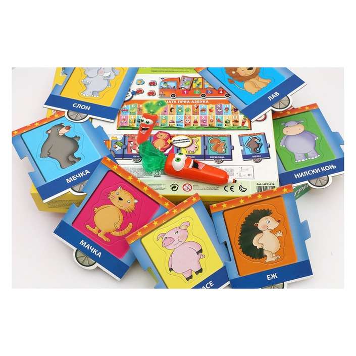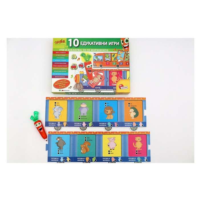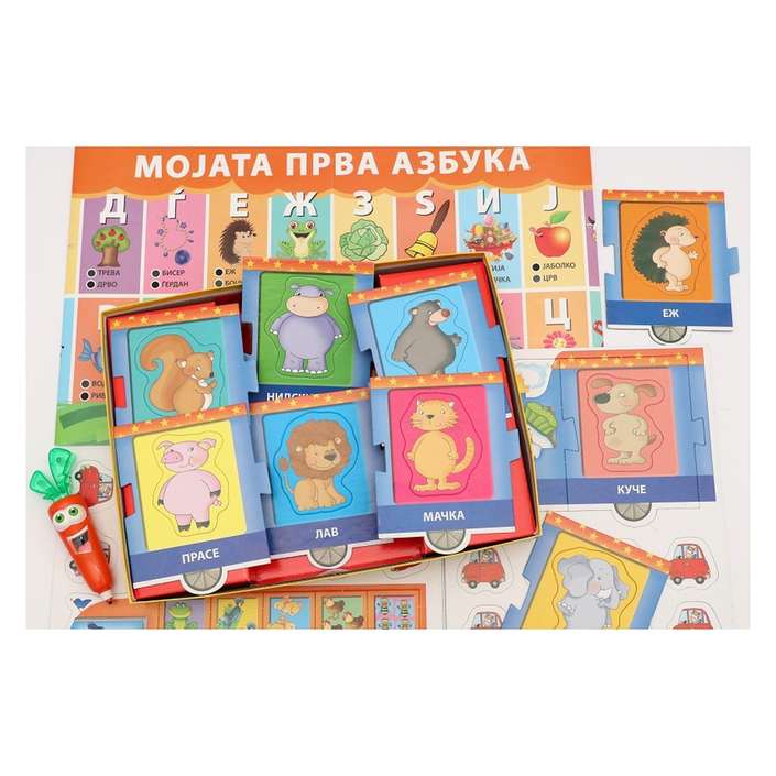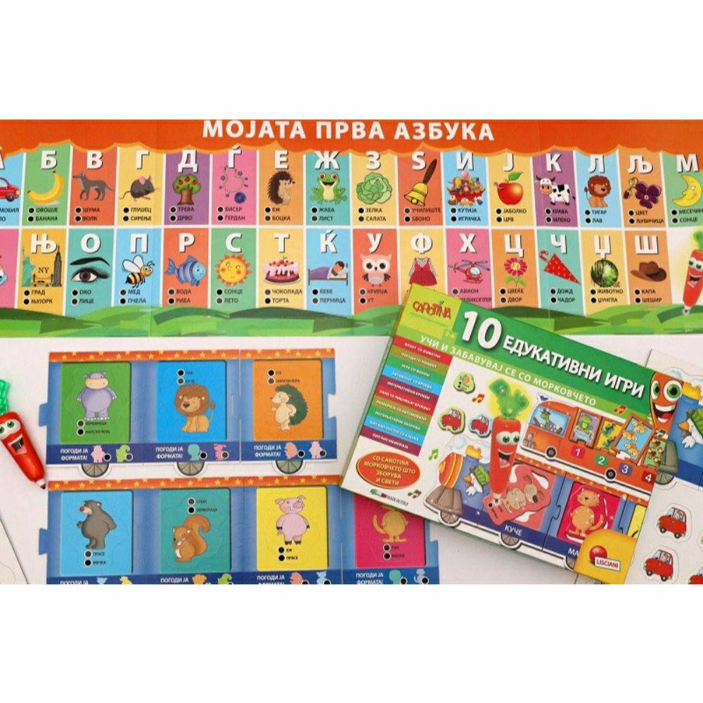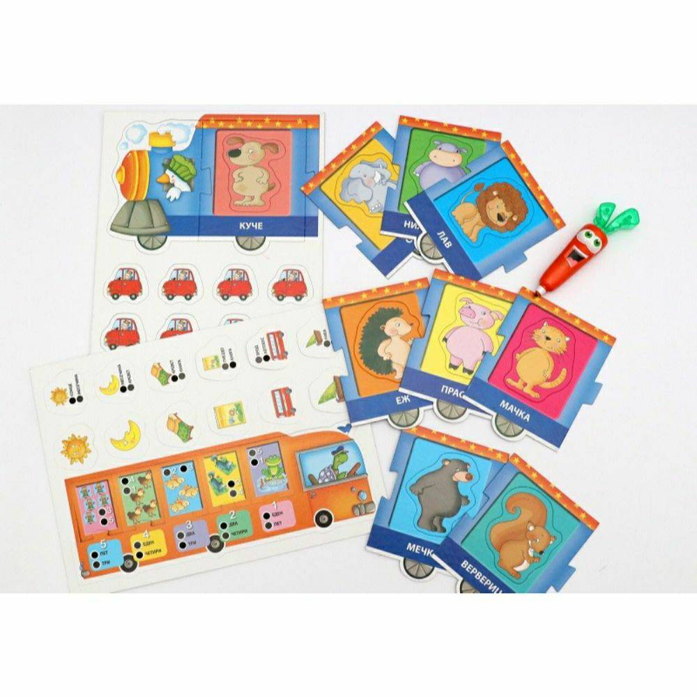 морковче што зборува и свети, воз со животни и броеви, 24 интерактивни карти за меморија и игри, постер со буквите на азбуката.