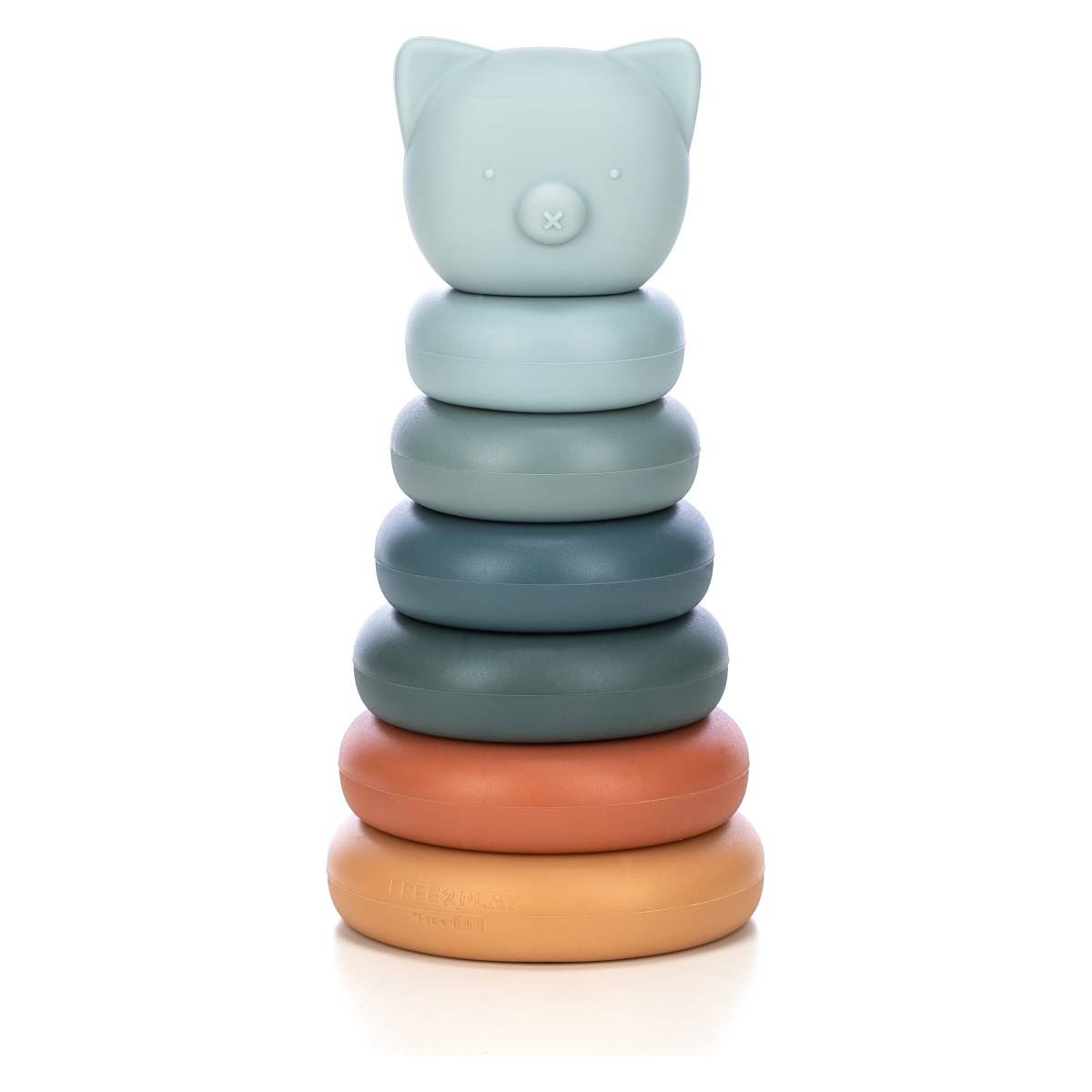 - Во пакувањето има 7 различни силиконски блокови, кои можат да се стават еден врз друг. Секој блок е со различна боја и големина. За полесно и позабавно лизгање, блоковите се конвексни. На врвот на склопената кула се става глава од плишаното мече, што ја прави кулата особено интересна и привлечна за детето..