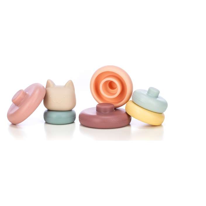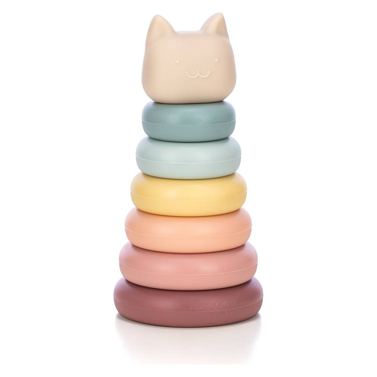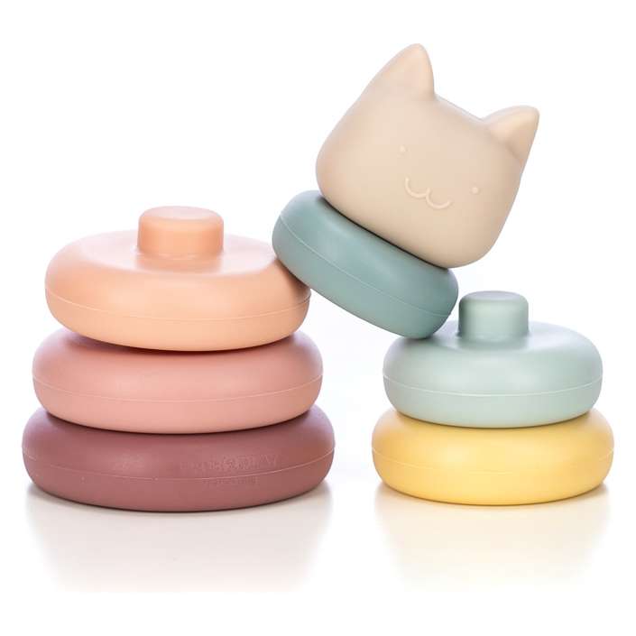 - Во пакувањето има 7 различни силиконски блокови, кои можат да се стават еден врз друг. Секој блок е со различна боја и големина. За полесно и позабавно лизгање, блоковите се конвексни. На врвот на склопената кула се става глава од плишано маче, што ја прави кулата особено интересна и привлечна за детето.