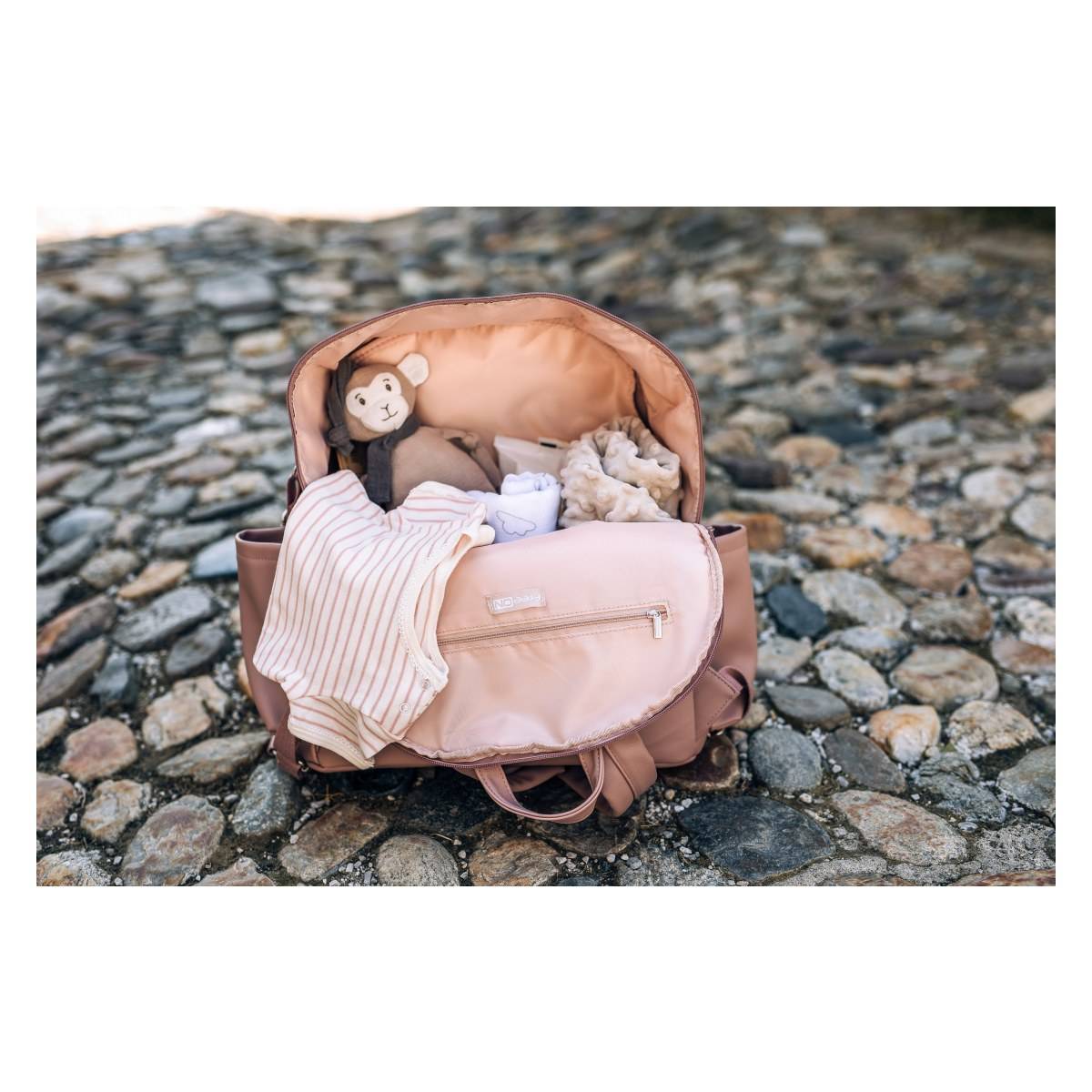 - Вклучена е подлога за превивање, за да можете да го пресоблекувате вашето бебе каде било и во секое време. Ќесичката за пелени можете да ја закачите на количката.