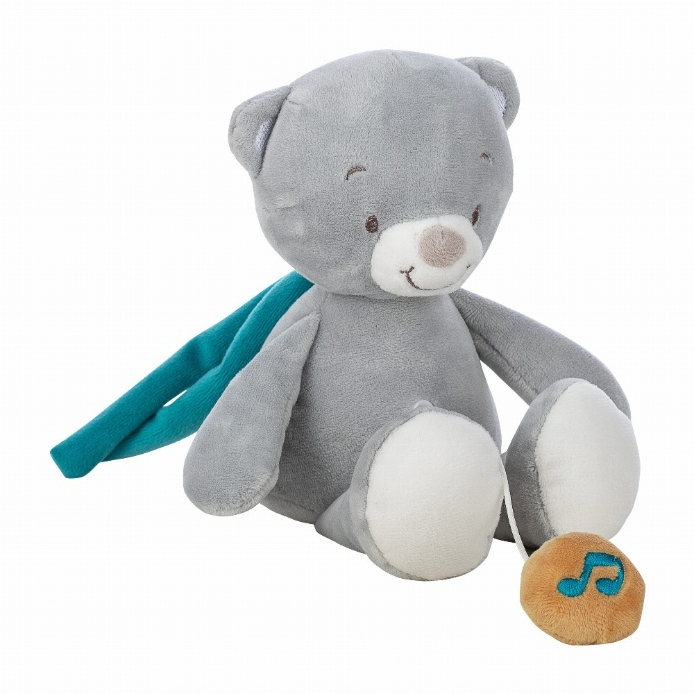 Дизајниран да обезбеди удобност и забава за бебињата и малите деца, располага со меко и гушкачко мече со вградена музичка кутија што свири смирувачка приспивна песна, Совршена за доенчиња и мали деца, помагајќи им да се чувствуваат смирени и опуштени, особено за време на спиење или пред спиење.
