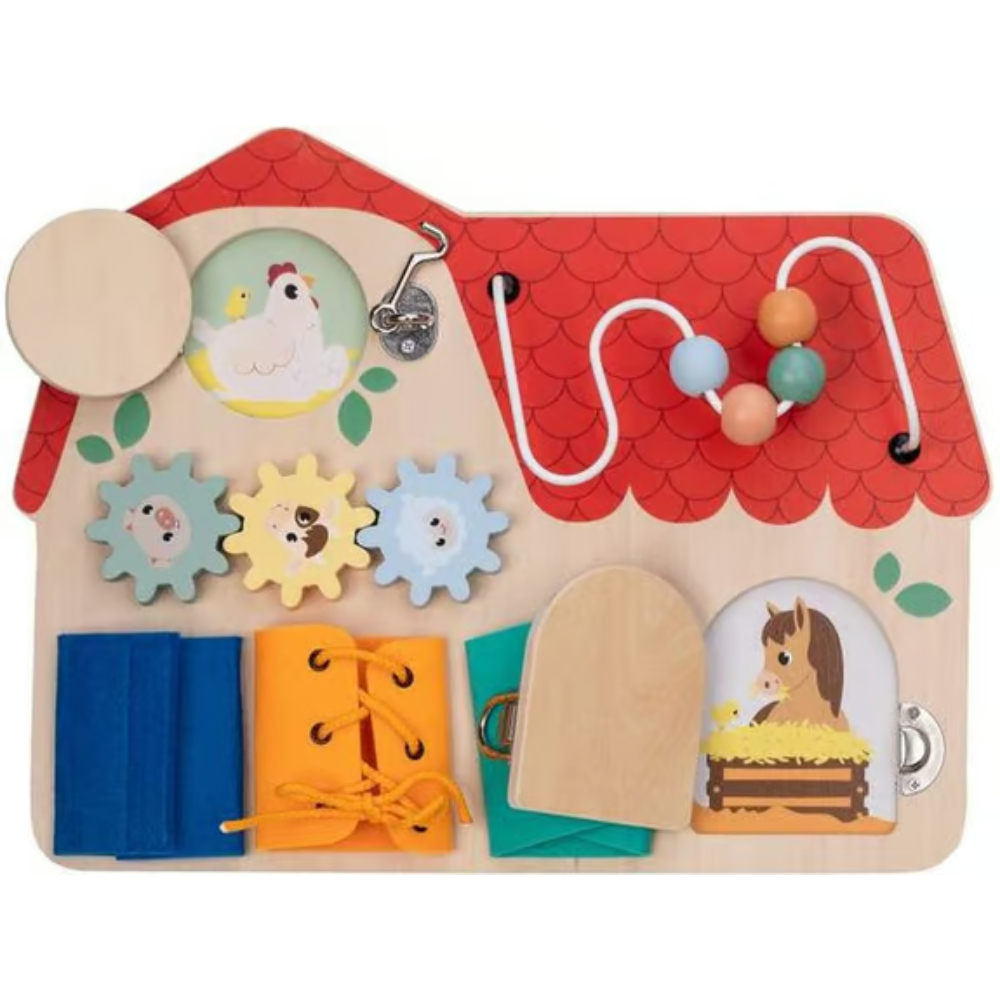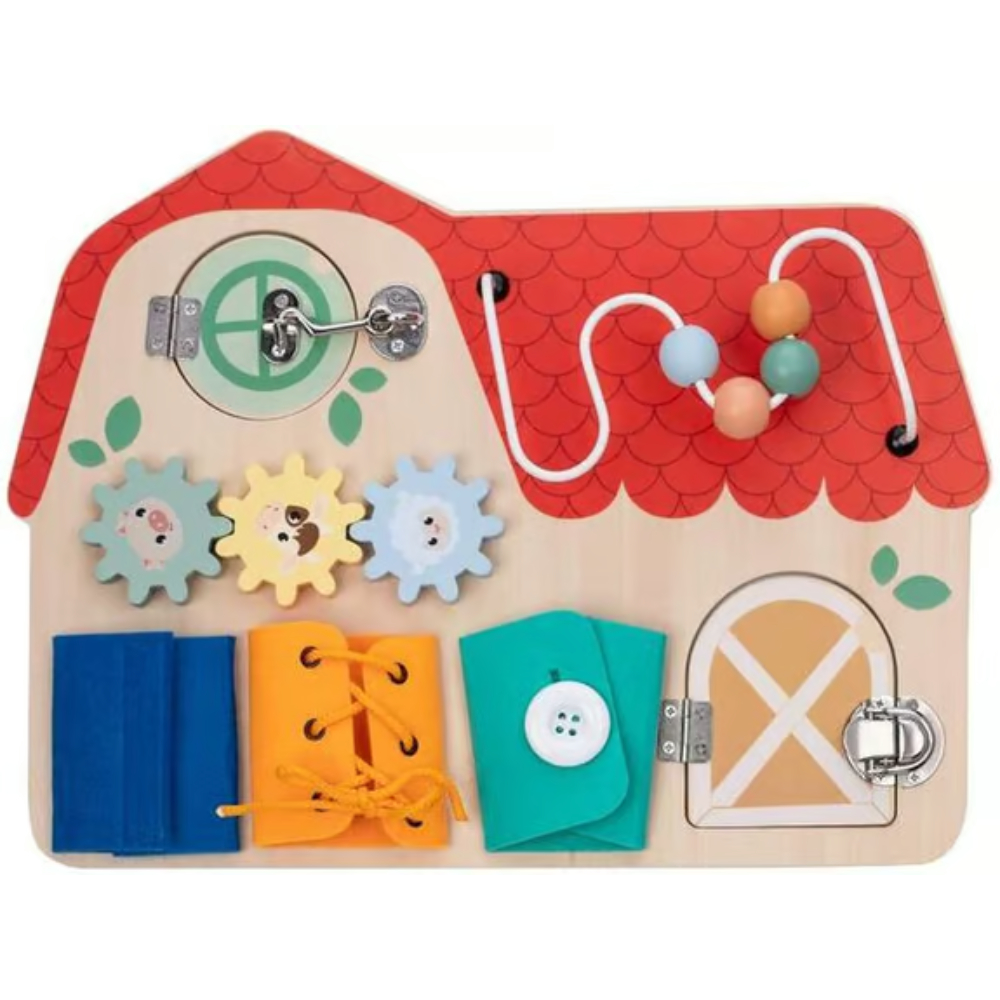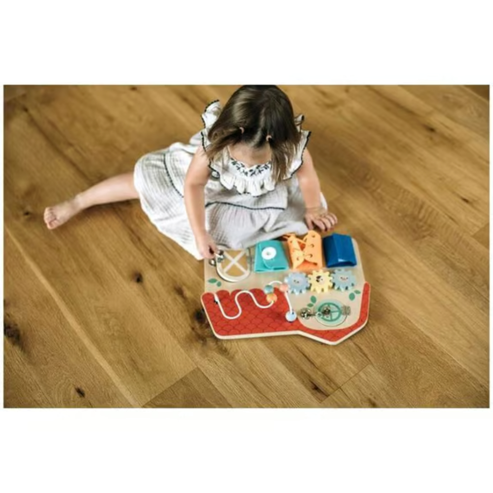Шарената табла за активности ќе биде вистинска забава за вашето малечко. Отворајќи ги прозорците открива што се крие зад нив. Таблата го поттикнува развојот на фини моторни вештини, координација рака-око и имагинација.