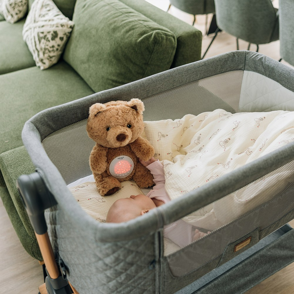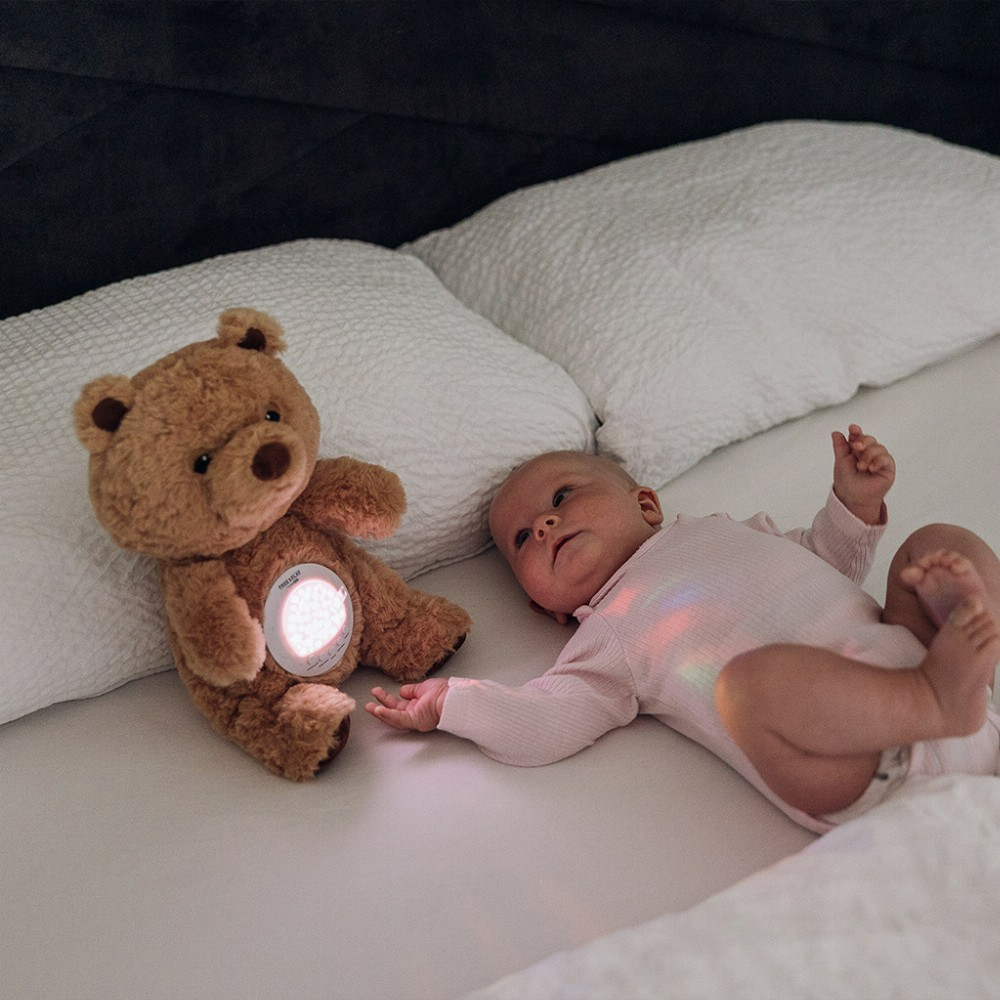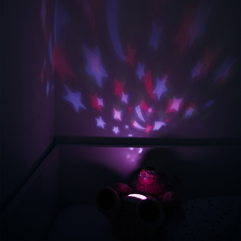 - Додека вашето дете ја гледа нежната проекција и ја слуша смирувачката мелодија, постепено ќе се опушти и ќе заспие. Меката и пријатна плишана играчка има 7 режими на проекција, 60 приспивни песни, 6 звуци на бел шум и 5 прилагодливи нивоа на јачина на звук. Доаѓа со 3 заменливи капаци за да се создадат различни светлосни проекции (ѕвездено небо, океан, ноќно светло).