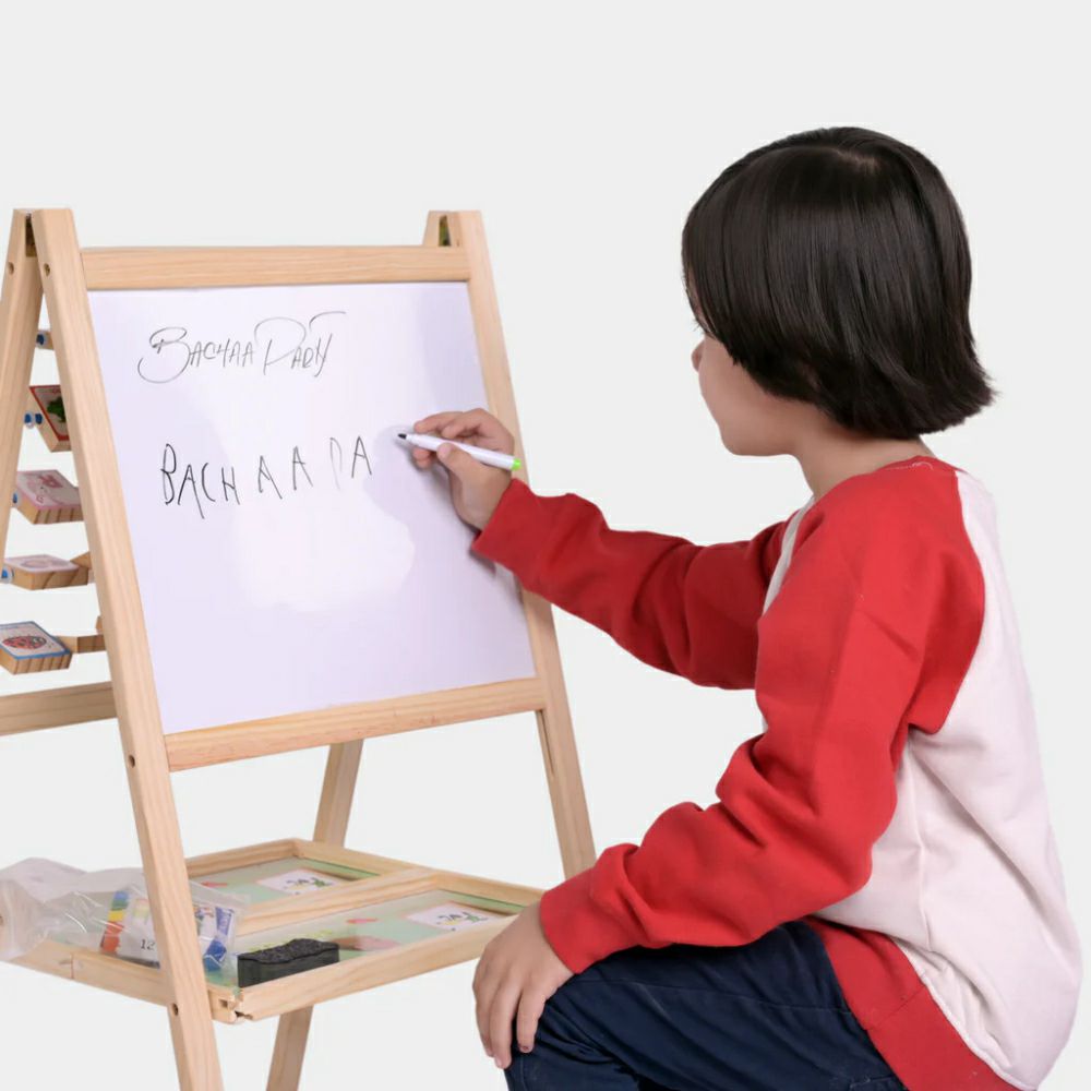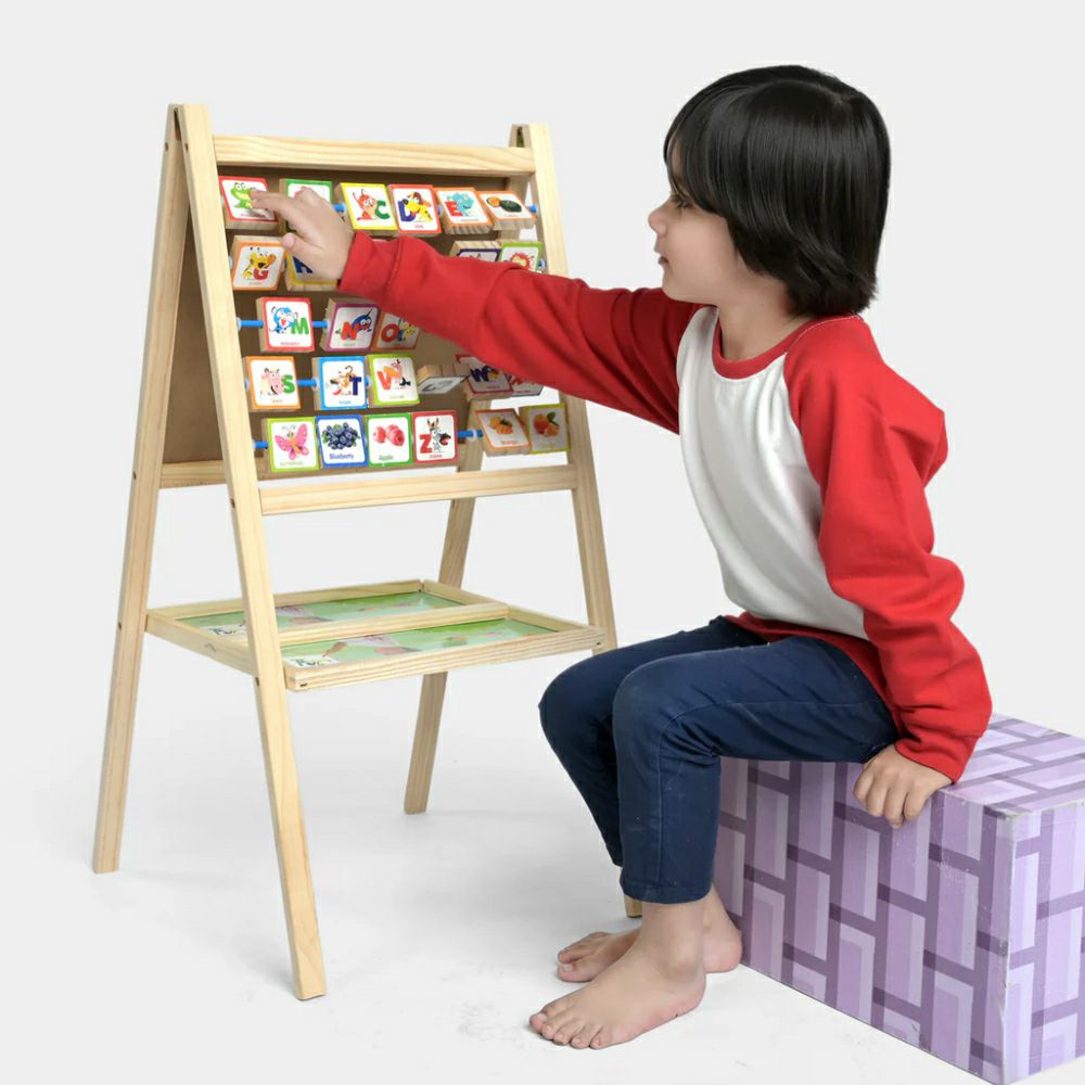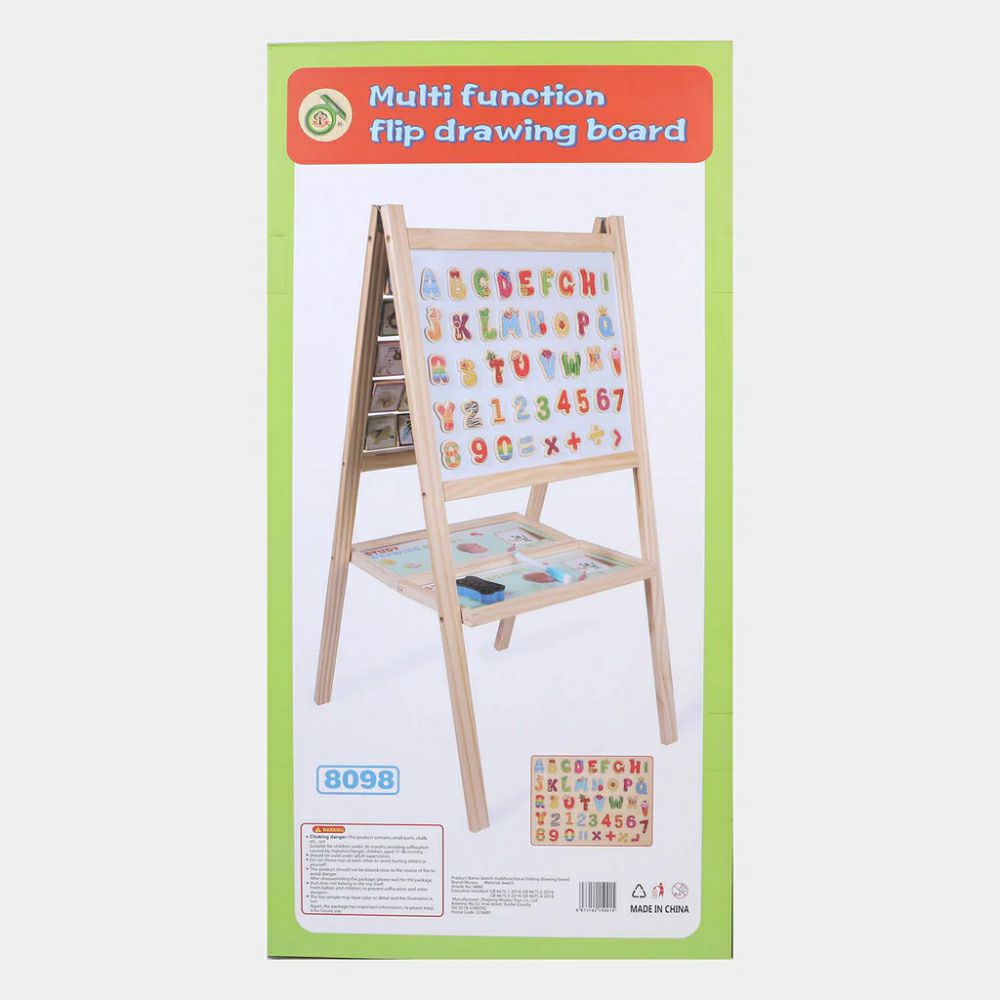 - Ви ја претставуваме дрвената двострана повеќенаменска преклопна табла за цртање со голем држач, разновидна и привлечна алатка за развој на децата.