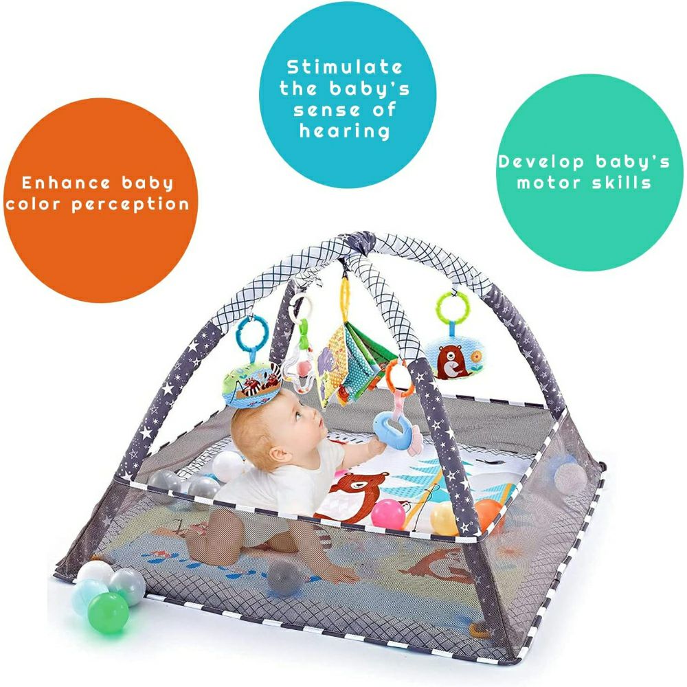Вклучени 20 топки, 5 различни играчки кои се закачуваат.