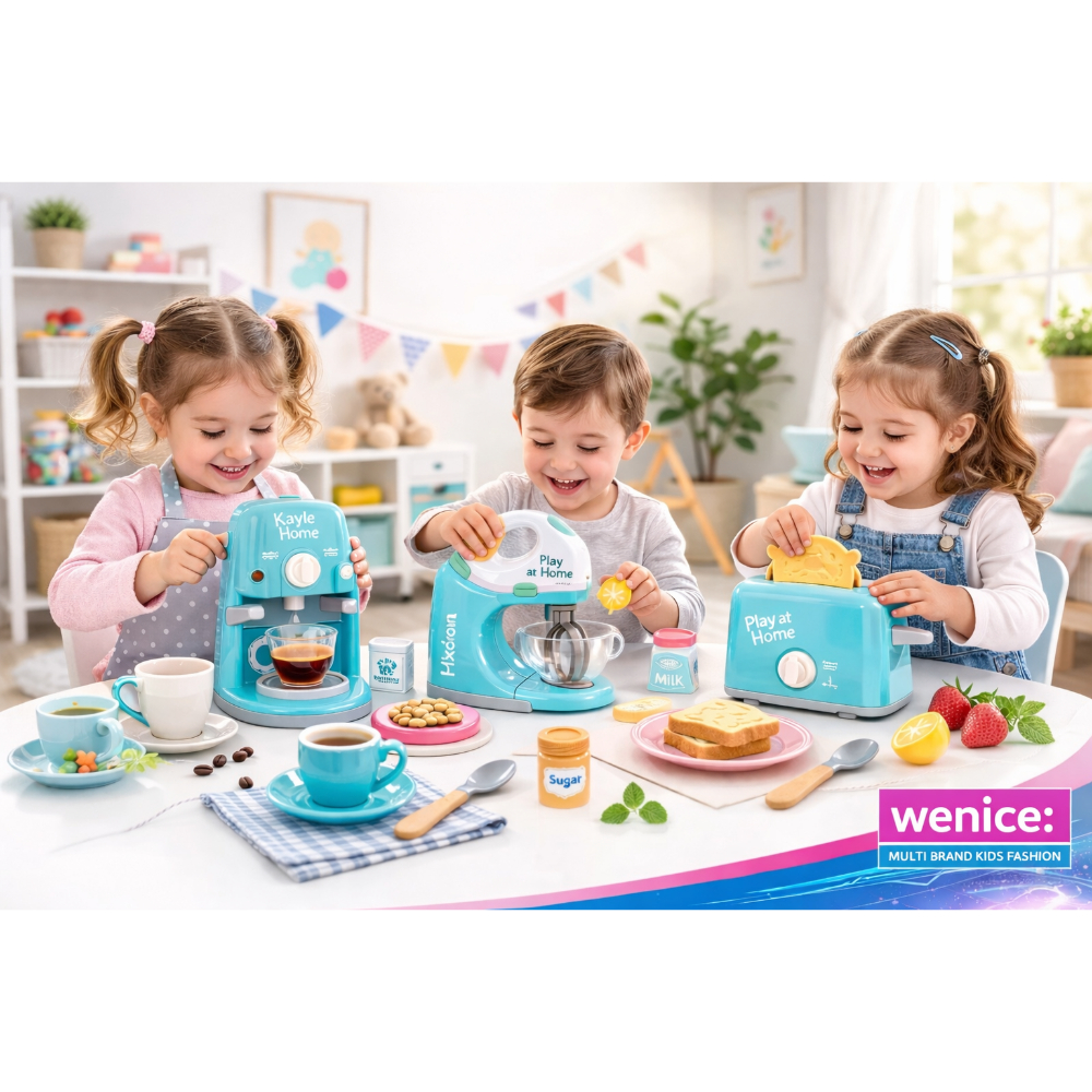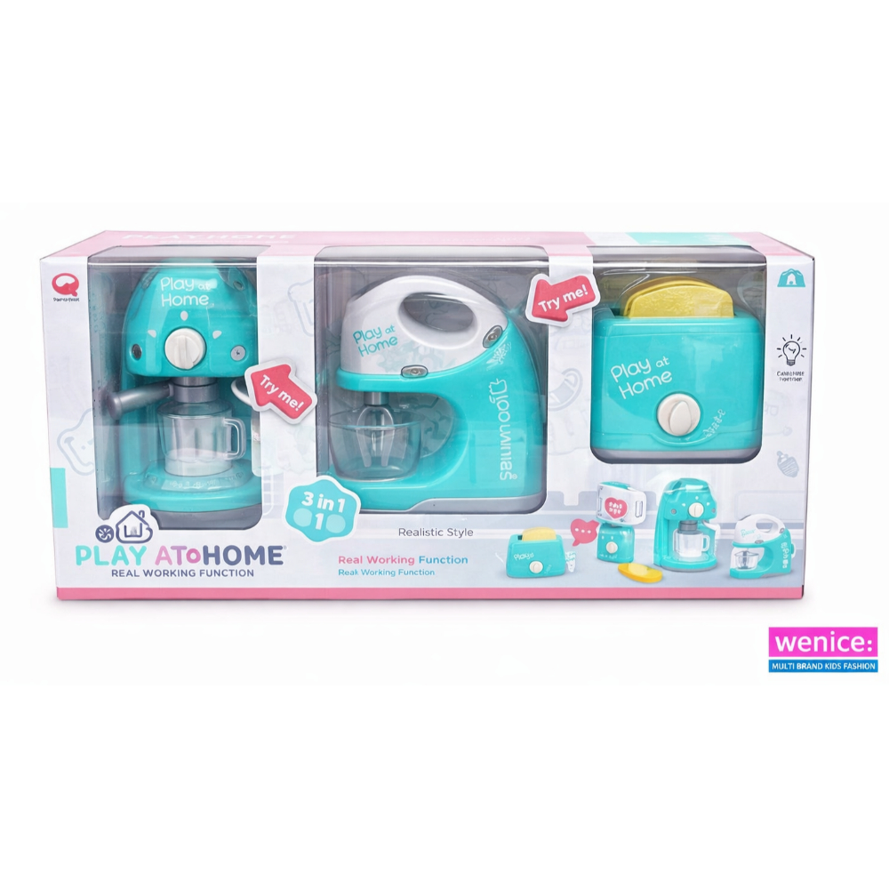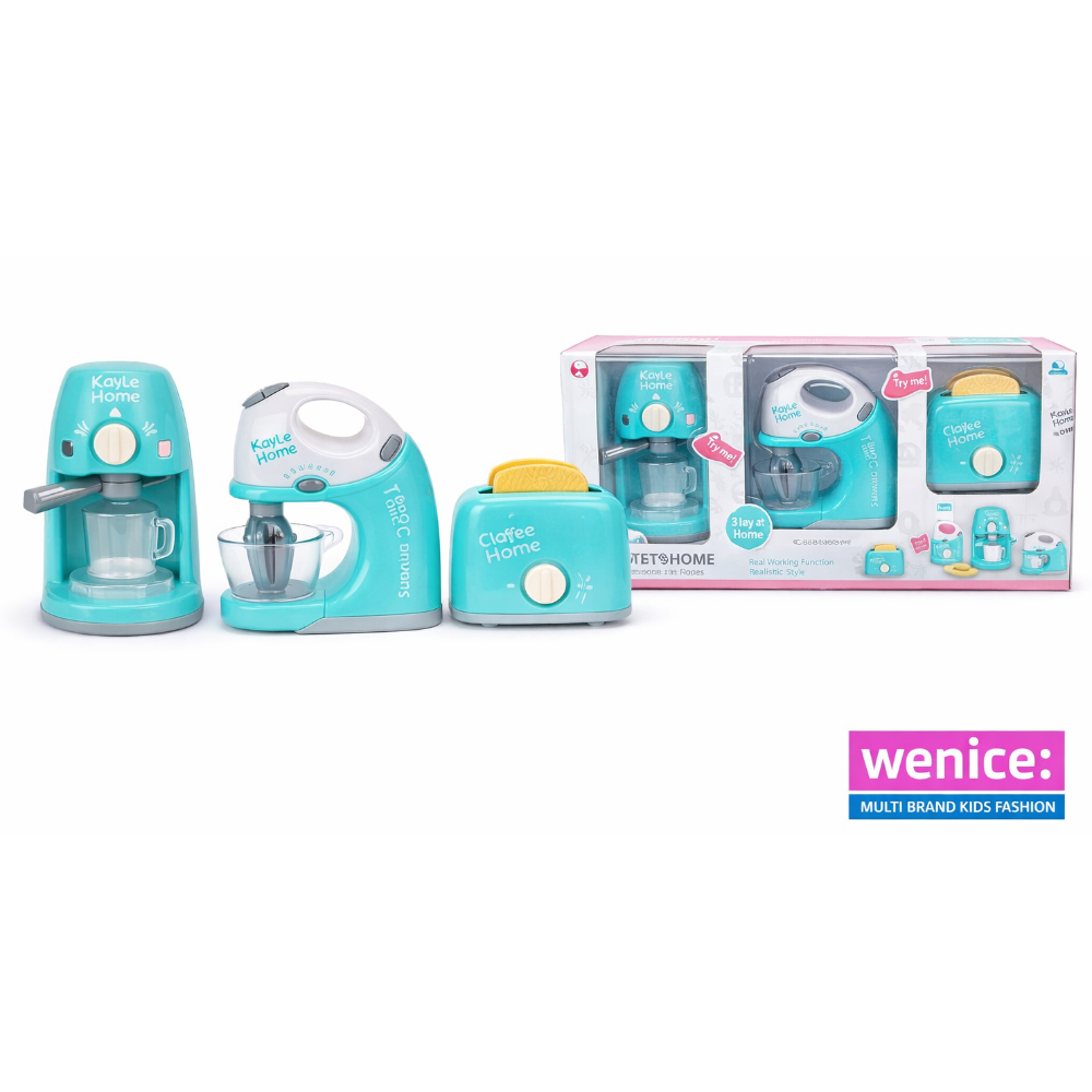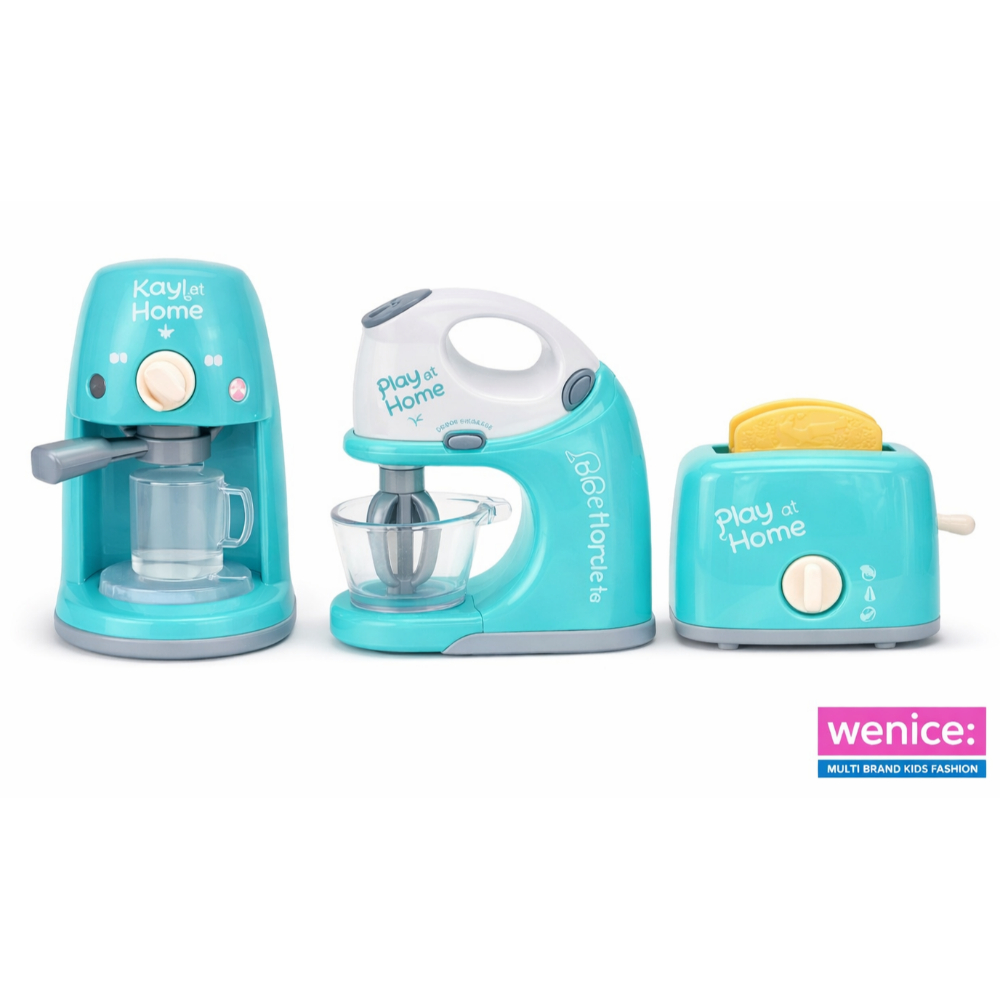 Сетот содржи 3 апарати: Кафемат, Блендер и Печка за лепчиња во тиркизна боја.