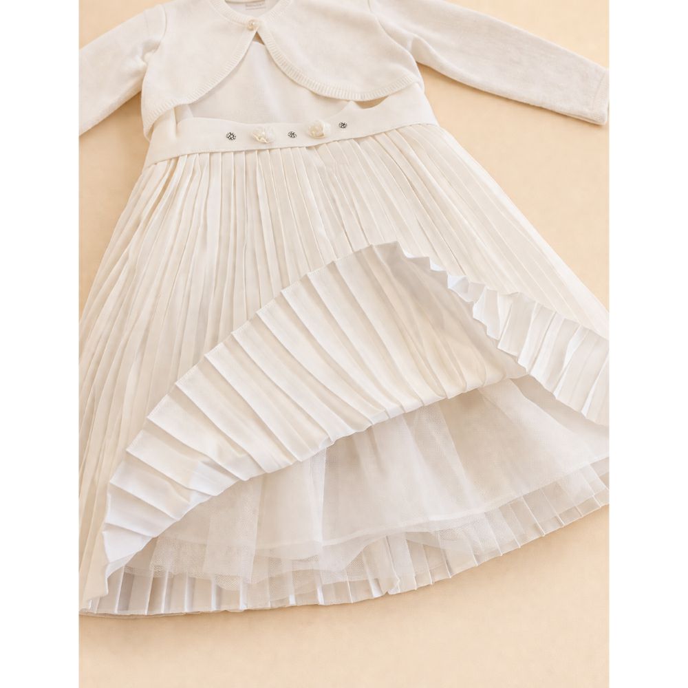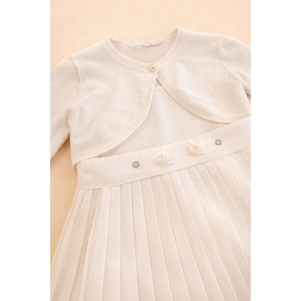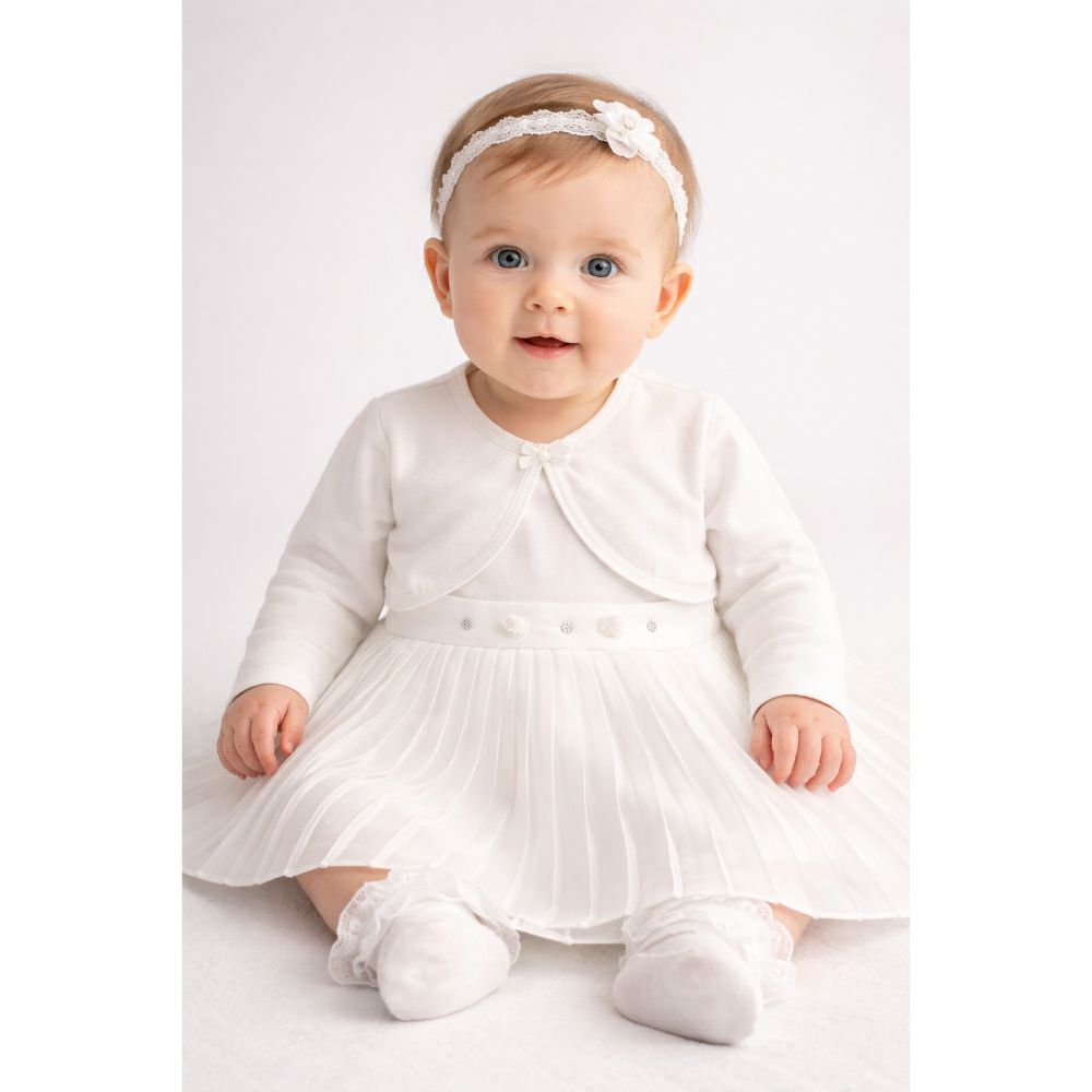 • Нежен и елегантен фустан за бебиња во класична бела боја, создаден за посебни моменти. Фустанот се одликува со префинета плисирана сукња која дава волумен и движење, додека декоративниот појас со суптилни апликации додава доза на луксуз.