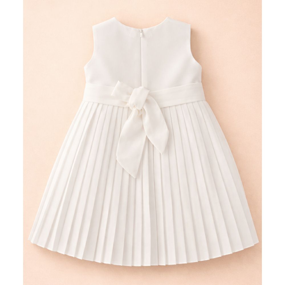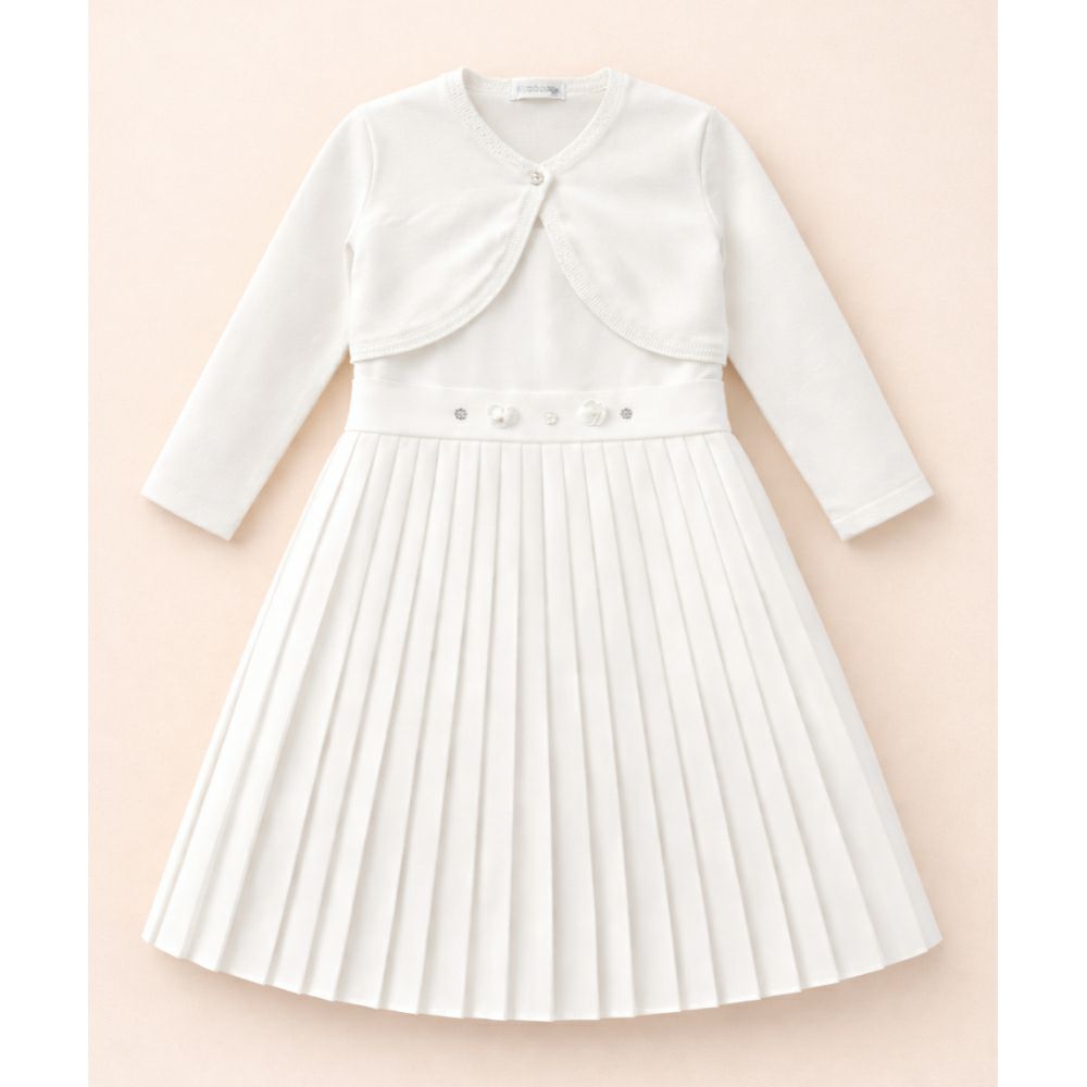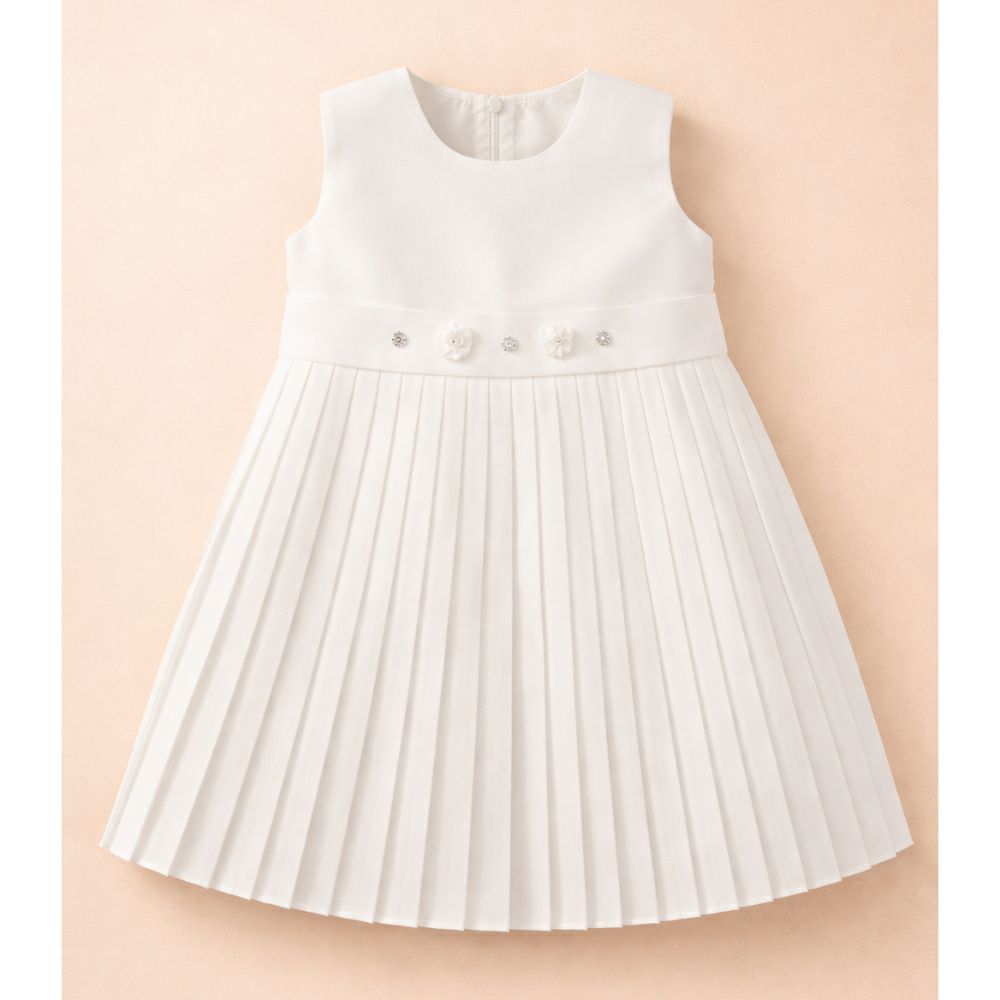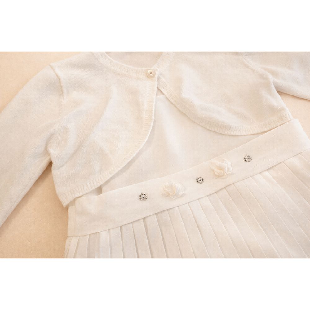 • Нежен и елегантен фустан за бебиња во класична бела боја, создаден за посебни моменти. Фустанот се одликува со префинета плисирана сукња која дава волумен и движење, додека декоративниот појас со суптилни апликации додава доза на луксуз.