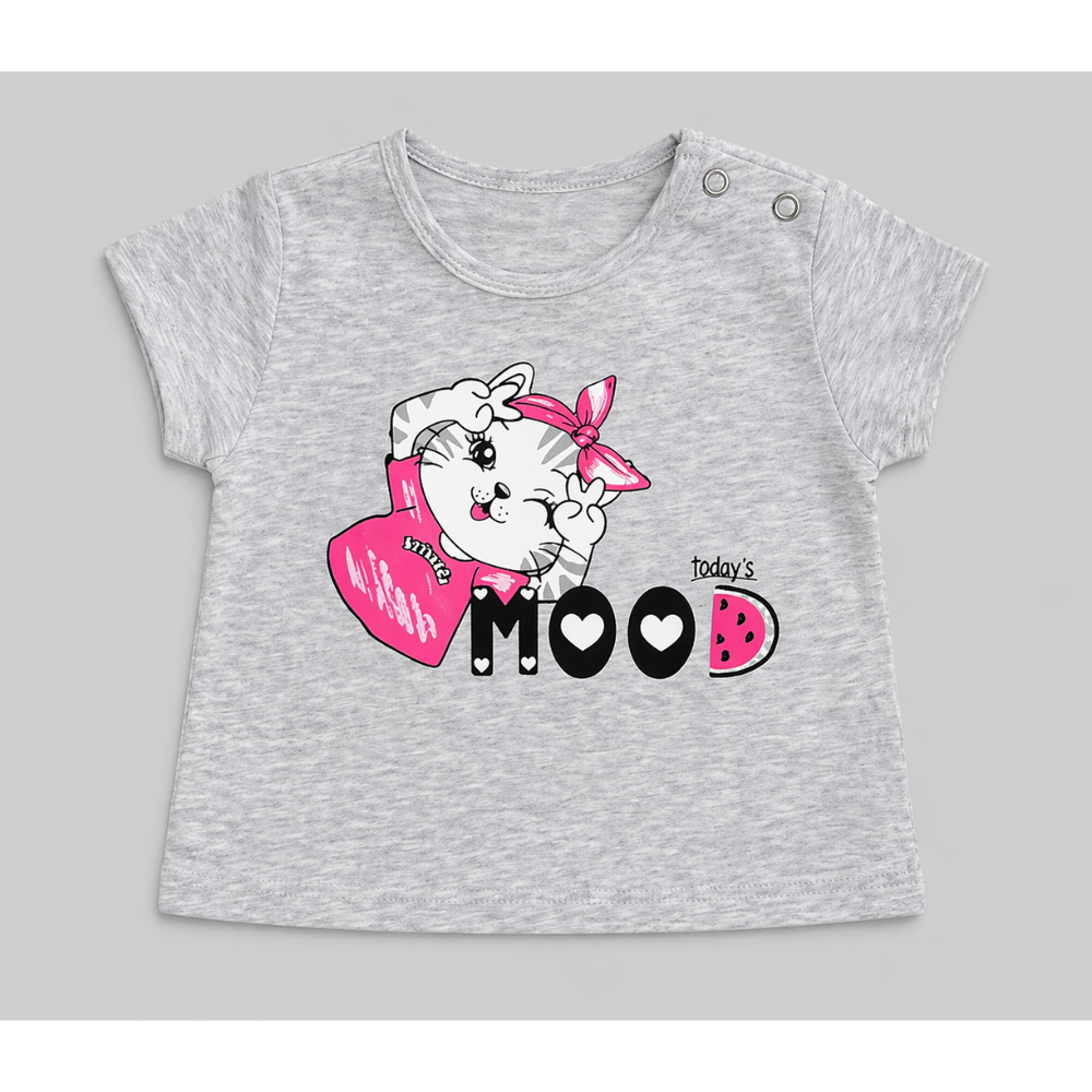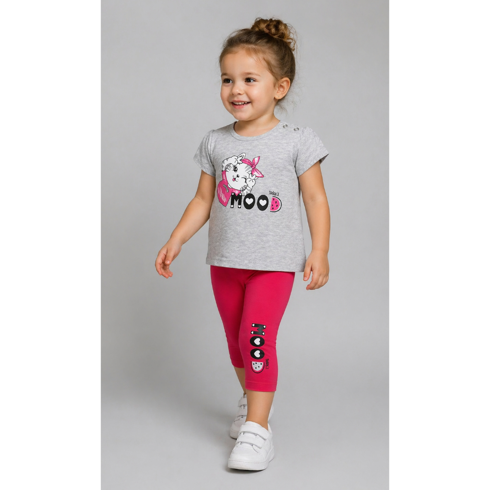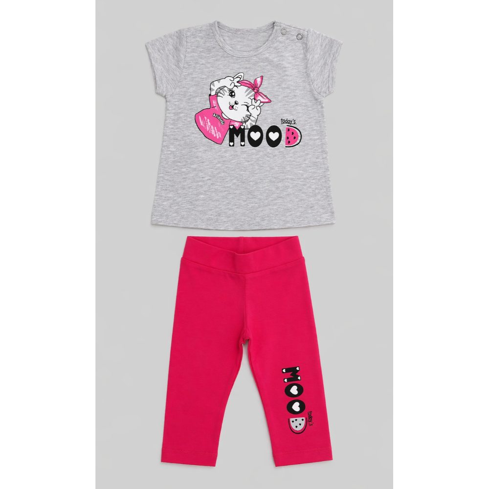 • Весел и модерен комплет кој носи разигран дух во секојдневниот стил. Сивата маица со симпатичен принт на маче и натпис „MOOD“ дава уникатен карактер, додека впечатливите розеви хеланки додаваат боја и удобност.