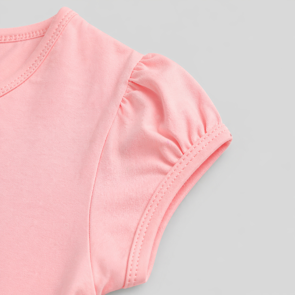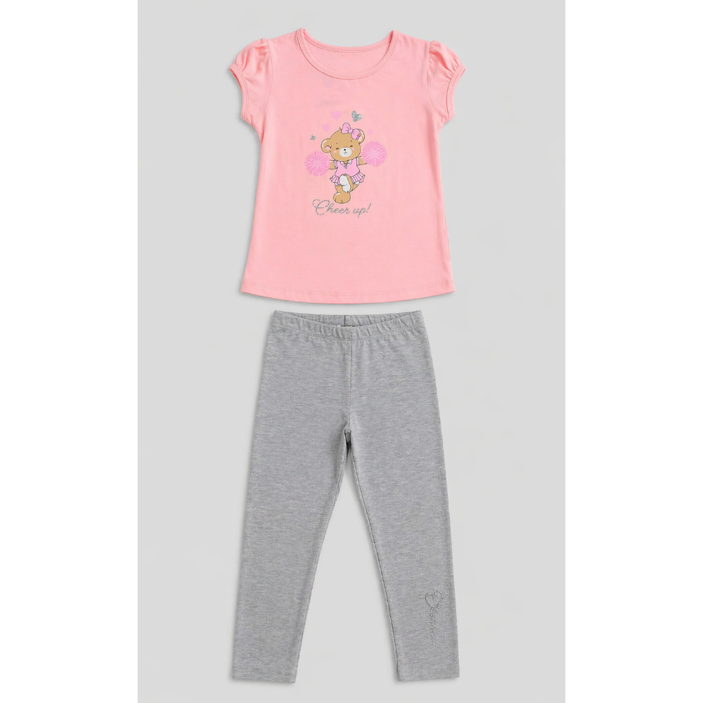• Нежен и удобен комплет совршен за секојдневни активности и игра. Маицата во пастелно розова боја со симпатичен принт носи весела нота, додека сивите хеланки обезбедуваат максимална удобност и слобода на движење.