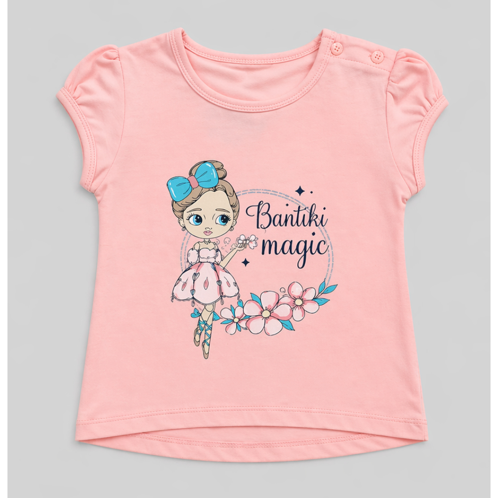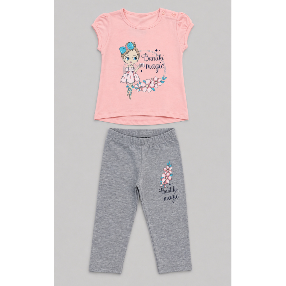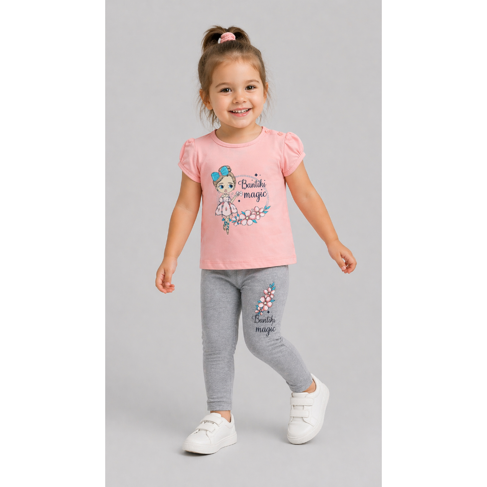 • Нежен и шармантен комплет инспириран од бајковит стил. Розовата маица со балерина принт и цветни детали внесува магија и елеганција, додека сивите хеланки со ист мотив го заокружуваат изгледот во совршен сет.