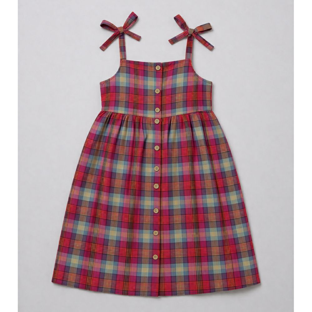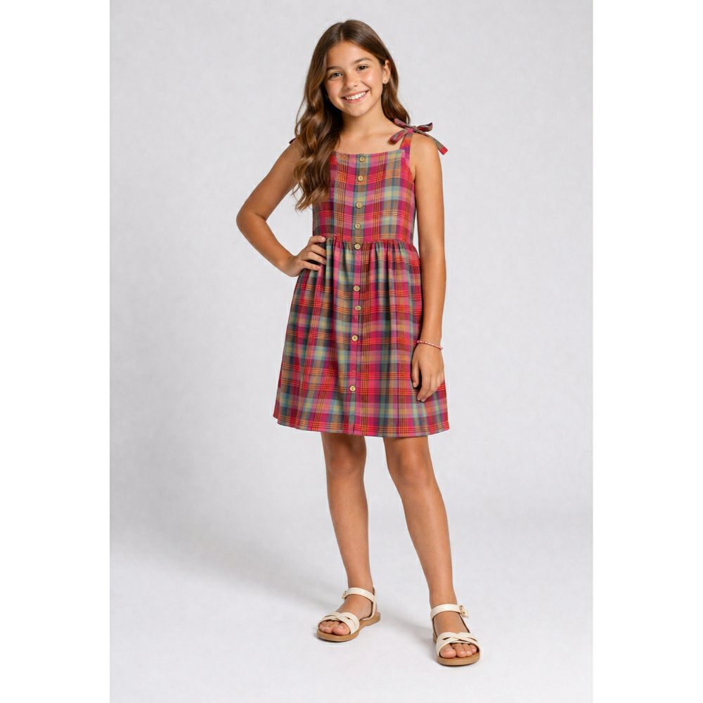 • Весел и модерен детски фустан со кариран дезен во живи бои, совршен за летни денови и секојдневни комбинации. Лесен и удобен модел со тенки прерамки кои се врзуваат со машнички – за прилагодување и дополнителен стил.