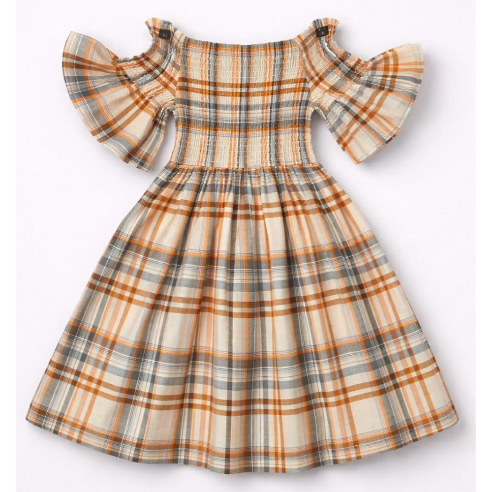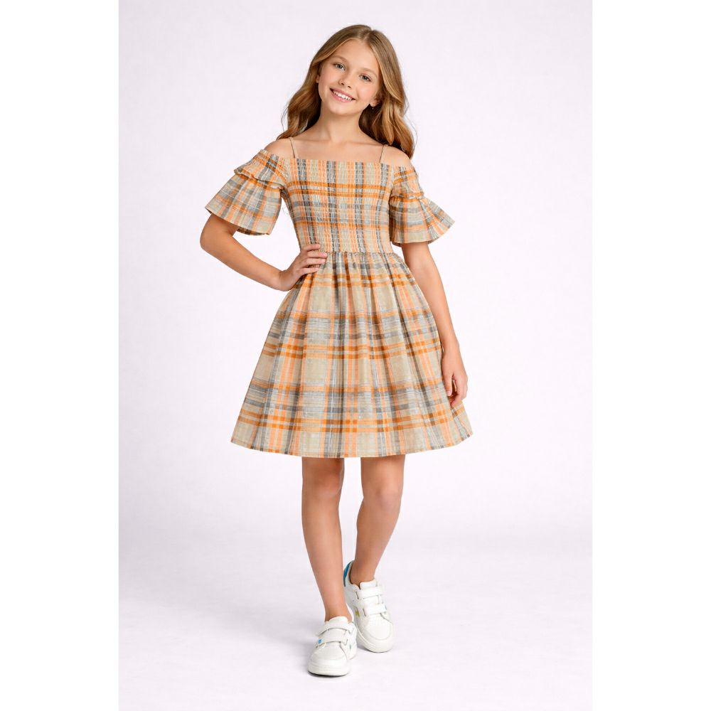 • Стилен и модерен детски фустан со кариран дезен, совршен за летни денови и тренди комбинации. Off-shoulder моделот со карнери дава посебен и елегантен изглед, додека еластичниот горен дел овозможува удобно прилегање.
