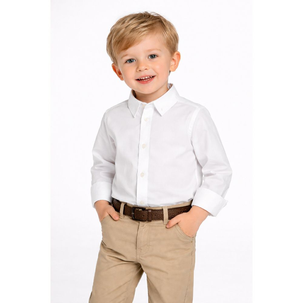 Оваа стилска бела кошула е идеален избор за мали момчиња, комбинирајќи елеганција и удобност. Изработена од лесен и пријатен материјал, овозможува целодневно носење без непријатност.