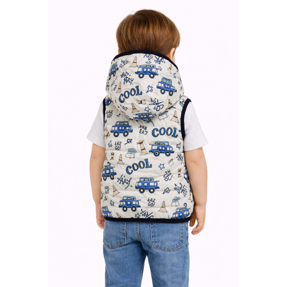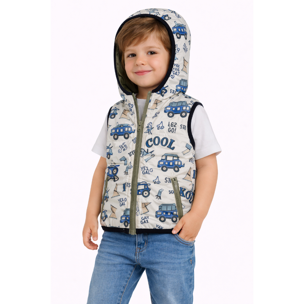 Другата страна е шушкава со коси отвори за џепчиња и принт од Truck форми и текст.