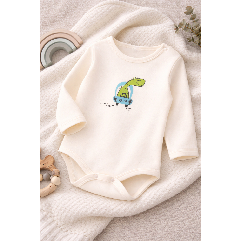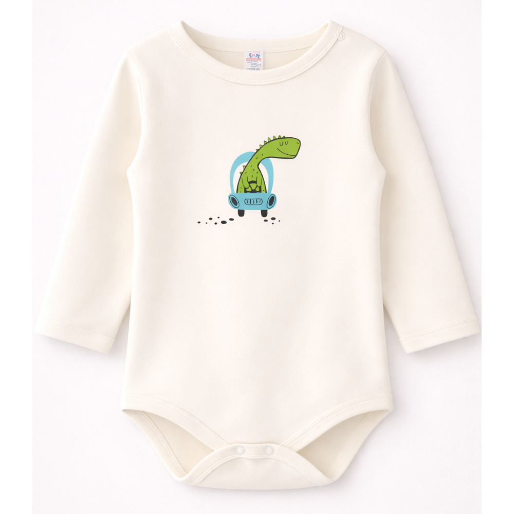 • Нежно и удобно бебешко боди во крем боја со симпатичен динo принт
