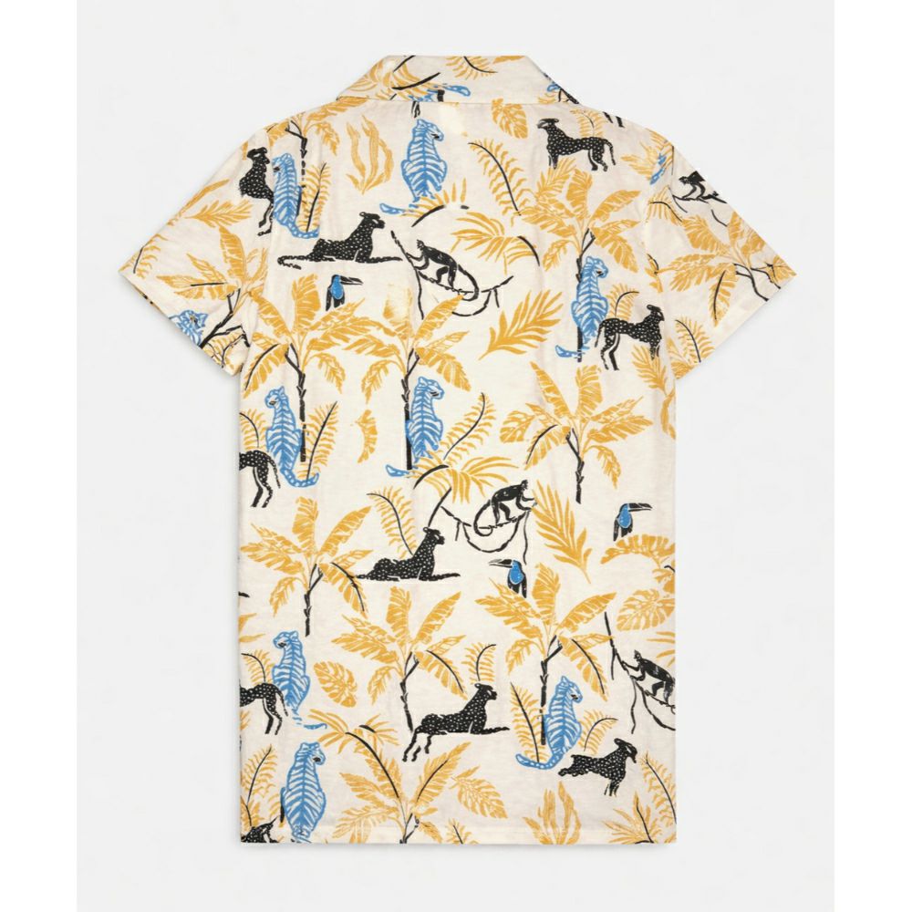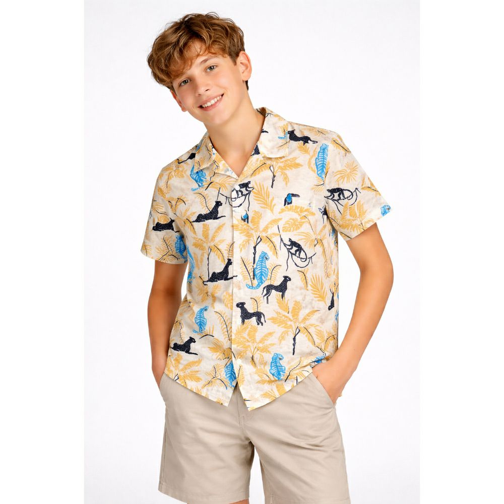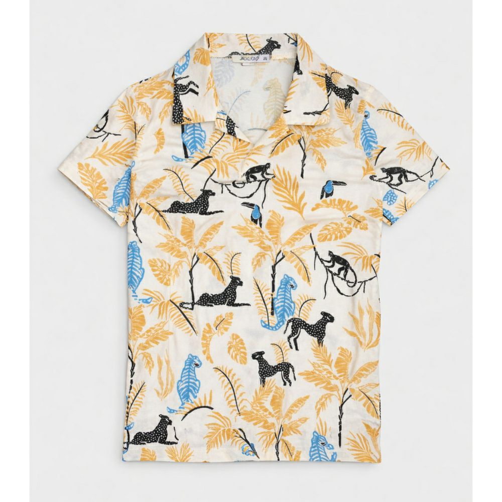 • Стилска летна кошула со модерен тропски дизајн, совршена за свеж и тренди изглед. Со уникатен принт од животни и листови, ова парче додава карактер и стил на секоја комбинација.
