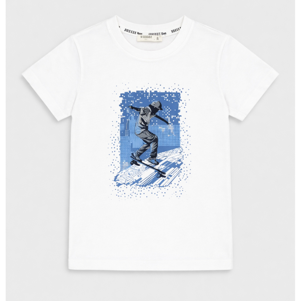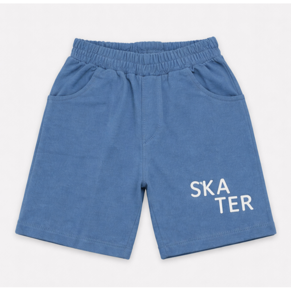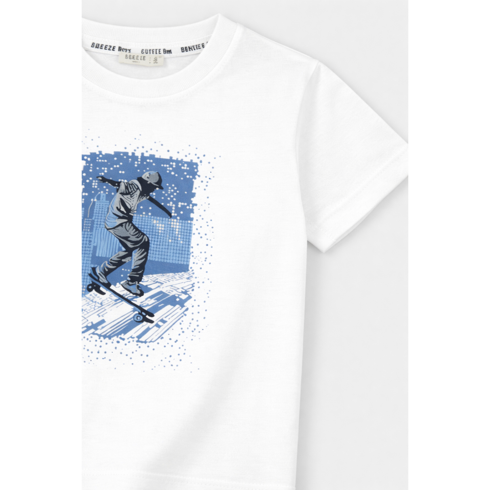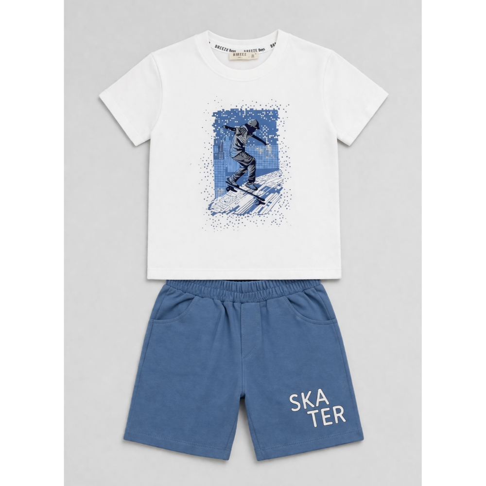 • Стилски и удобен комплет дизајниран за активни деца. Белата маичка со уникатен skateboard принт совршено се комбинира со модерните сини бермуди со „Skater“ натпис.