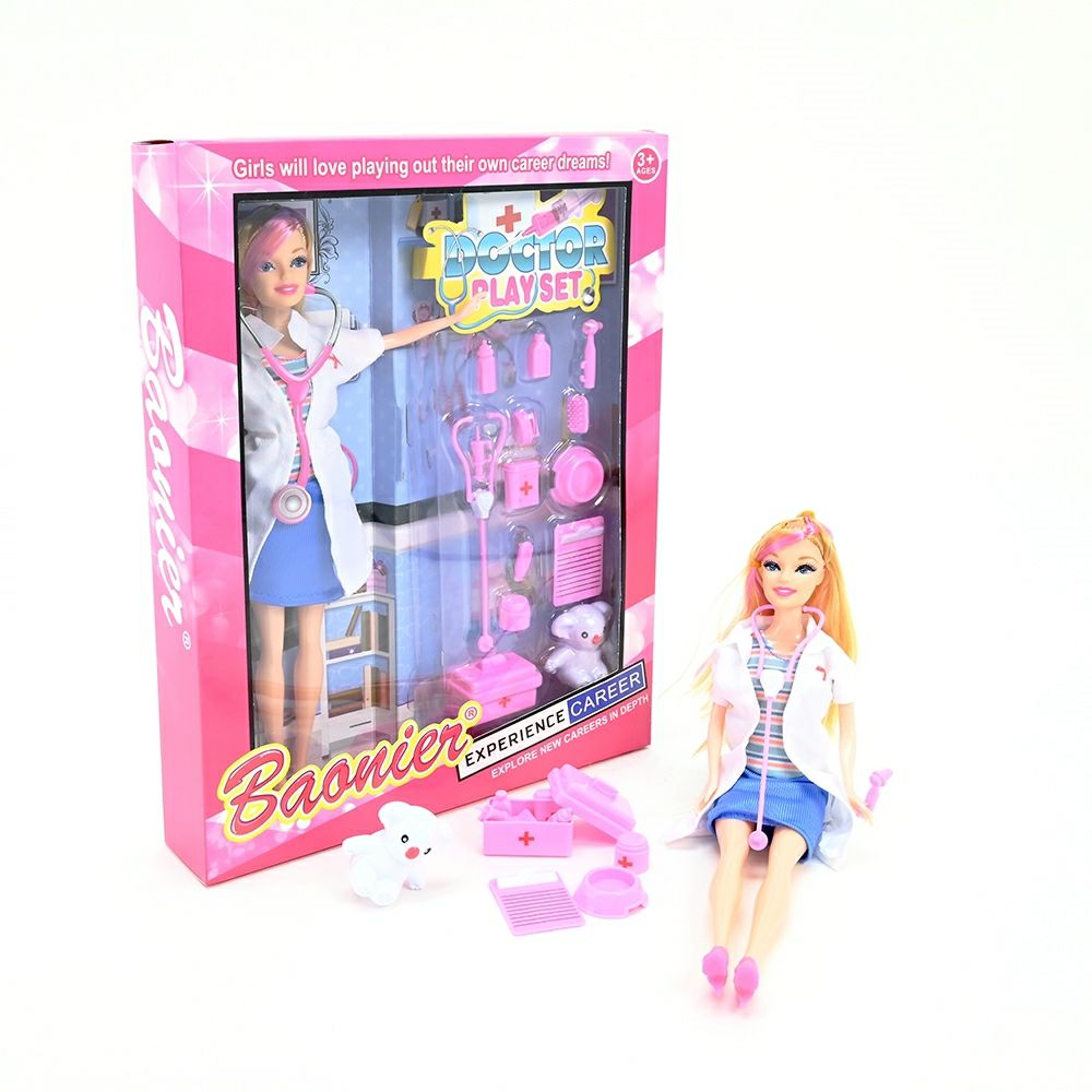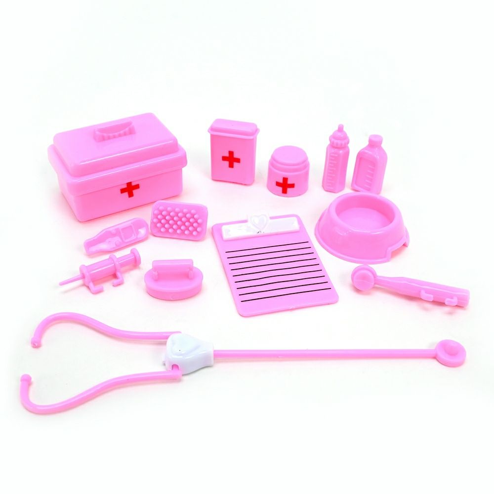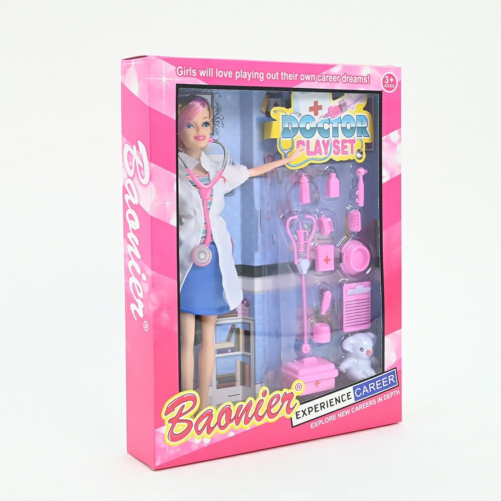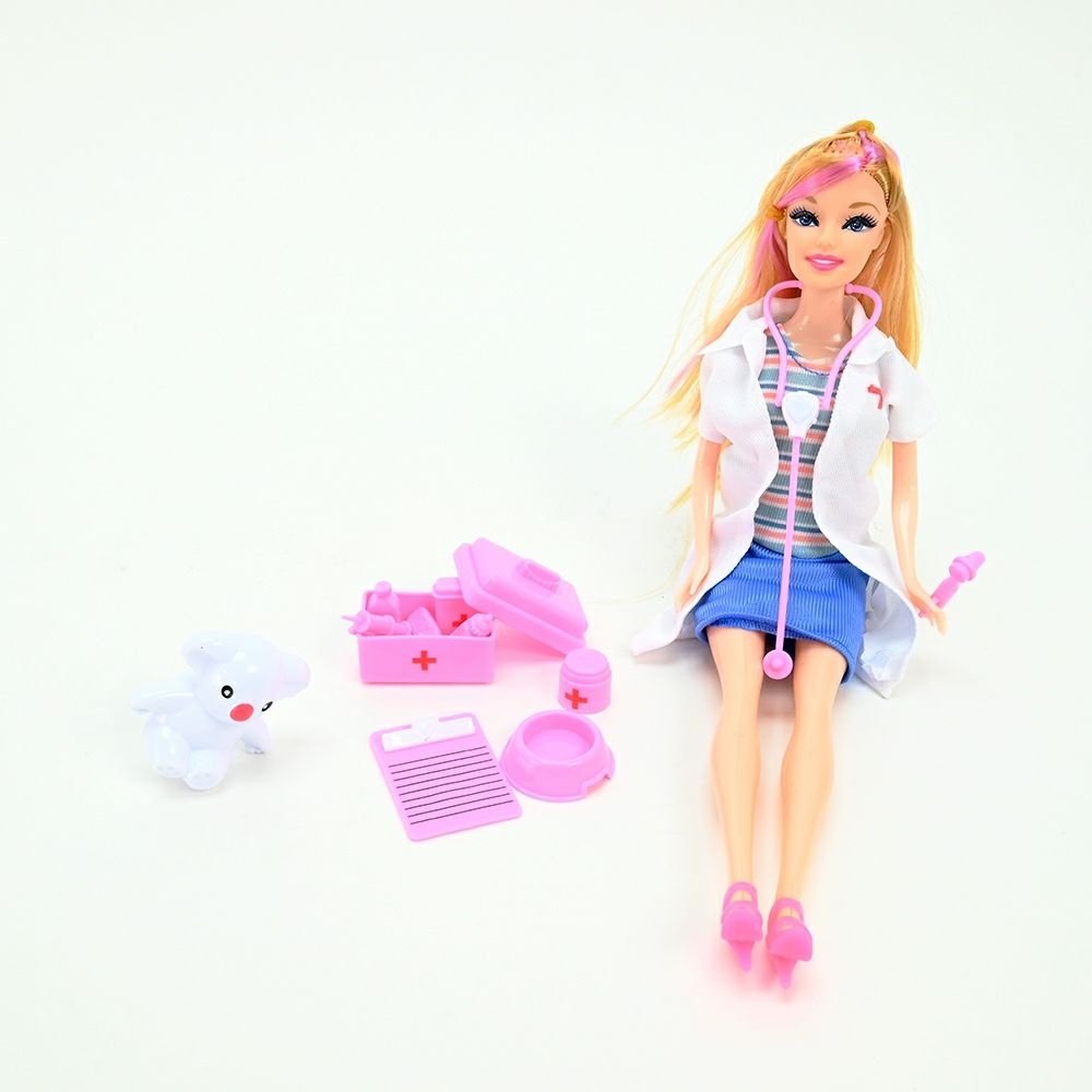 • Производот содржи барбика, мече, шприц, топломер, докторски слушалки, записник, шише, сируп и таблети.
