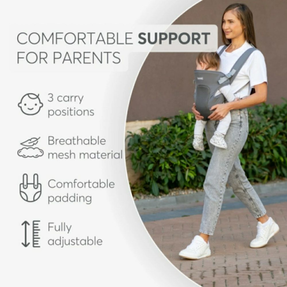 • 3 позиции за носење на бебето. Со лицето свртено кон родителот 3-12 месеци.Со лицето напред-кога бебето е веќе способно да си ја држи главата 3-12 месеци.На грбот на родителите 6-12 месеци.