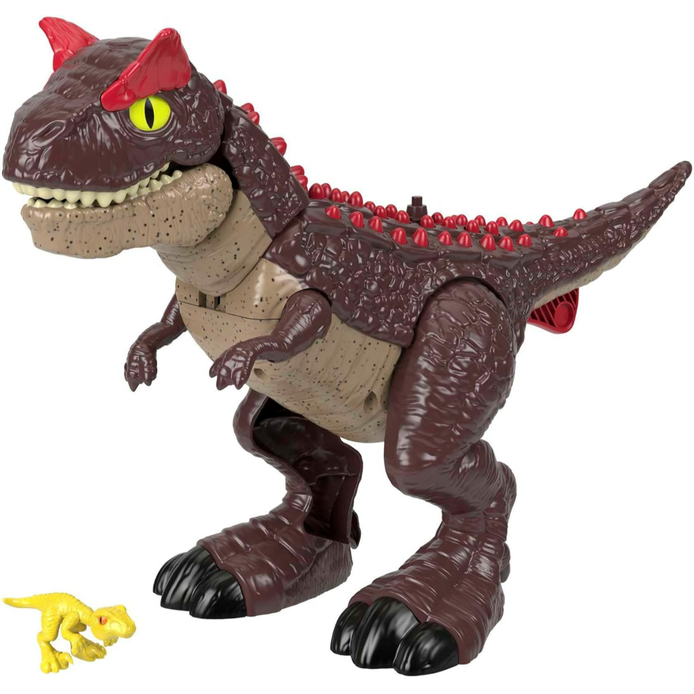 • Прикачете ја фигурата на бебето Раптор на грбот на Карнотаурот за да ја видите како го исфрла малиот напаѓач кога ќе и се пуштат шилците.