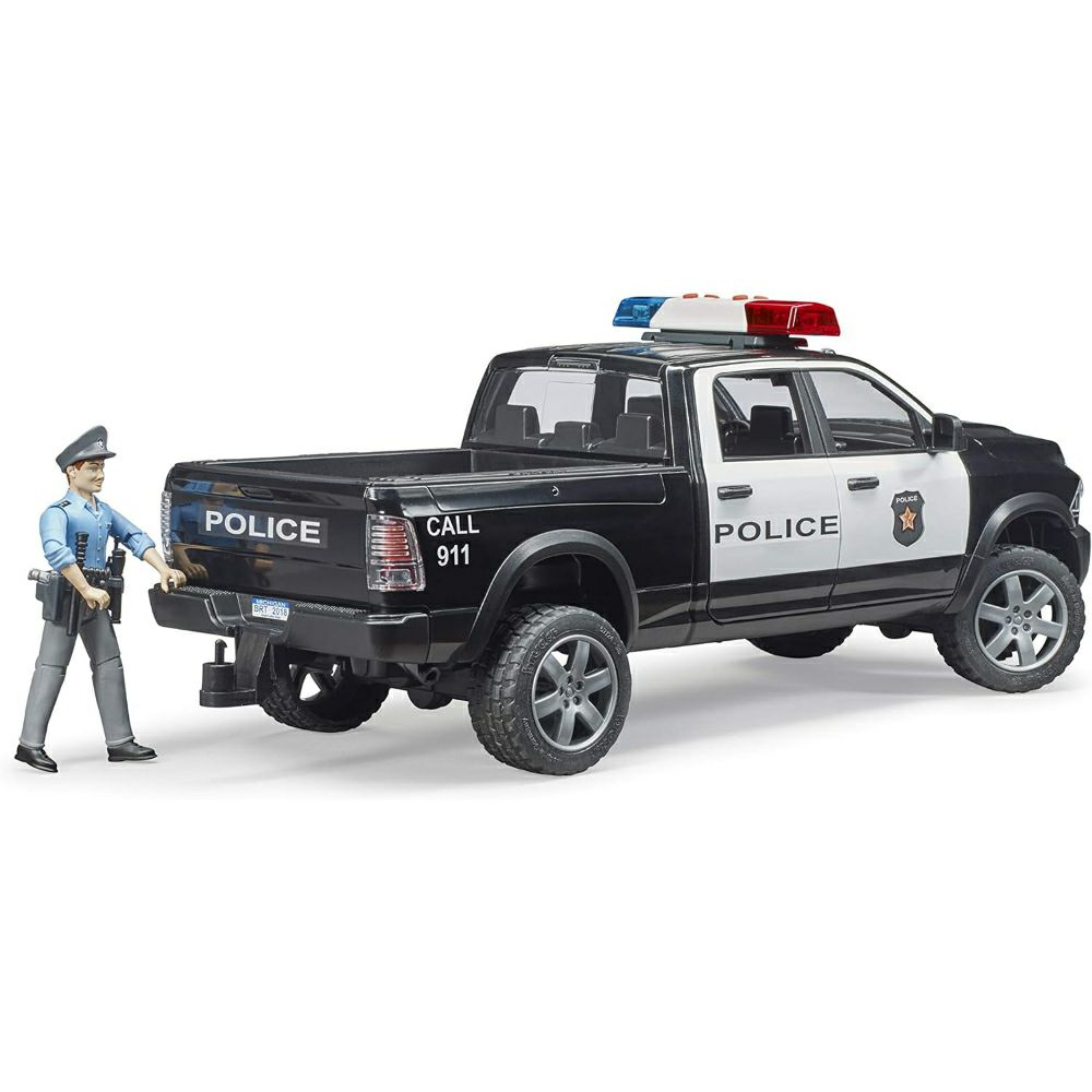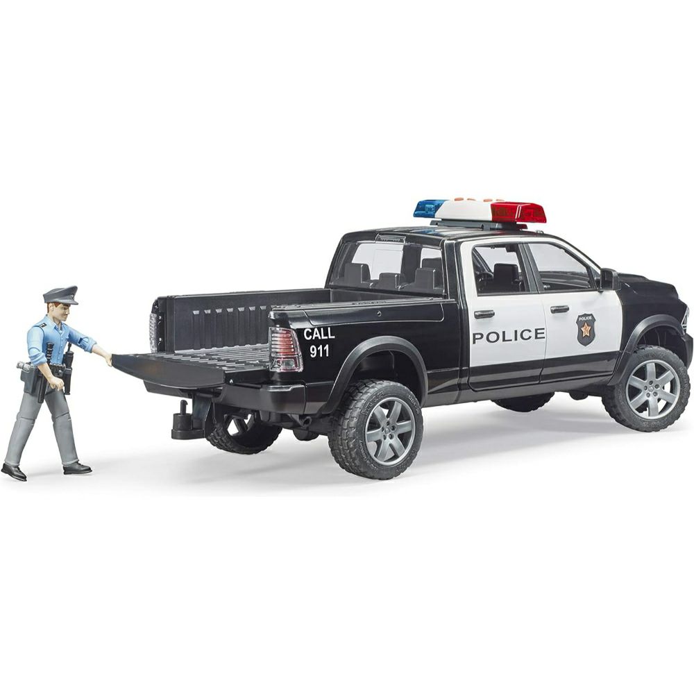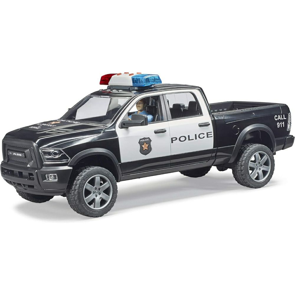 • Време е да ги засилиме полициските сили. Службите за итни случаи сега ќе можат да се движат и во тешко достапниот терен надвор од границите на градот благодарение на овој полициски џип пик-ап 4×4. Полициското возило се заснова на познатиот RAM 2500 џип и се одликува со привлечен и впечатлив дизајн, во боја од типично Американско полициско возило со светлина и звук поставен на покривот. Германскиот производител Bruder ја произведе оваа реплика од овој модел џип кои ќе ги воодушеви вашите најмили. Исто како и оригиналниот џип, оваа играчка има импресивни и иновативни функции затоа Bruder се единствени и уникатни на пазарот. Играчката има кабина за екипаж со четири врати. Сите врати се отворени за да се сместат четири фигури. Овој модел располага со амортизација за способност надвор од патот, воедно може да се управува со помош на вклученото продолжување на воланот. Вклучениот полицаец е одлично опремен и подготвен за голем број потенцијални распоредувања.