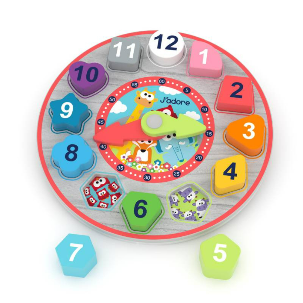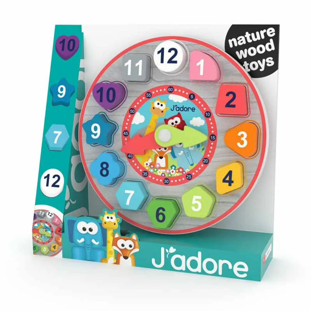• J’adore Wooden Clock Sorter е дрвена едукативна играчка што им помага на децата да ги научат броевите, формите и основите на времето преку игра. Со подвижни стрелки и вметнување дрвени бројчиња, играчката ја развива фината моторика, логичкото размислување и рака-око координацијата. Изработена е од природно дрво со нетоксични бои, безбедна и идеална за прво запознавање со часовникот.