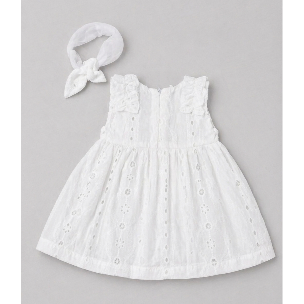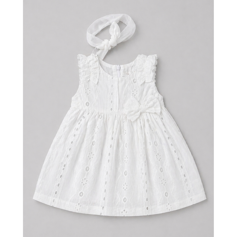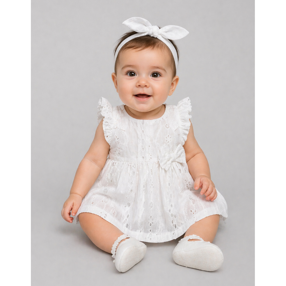 • Нежен и елегантен бебешки фустан со прекрасни везени детали, изработен од лесен и удобен материјал. • Комплетот вклучува и стилска лента за глава, создавајќи совршен изглед за најмалите.