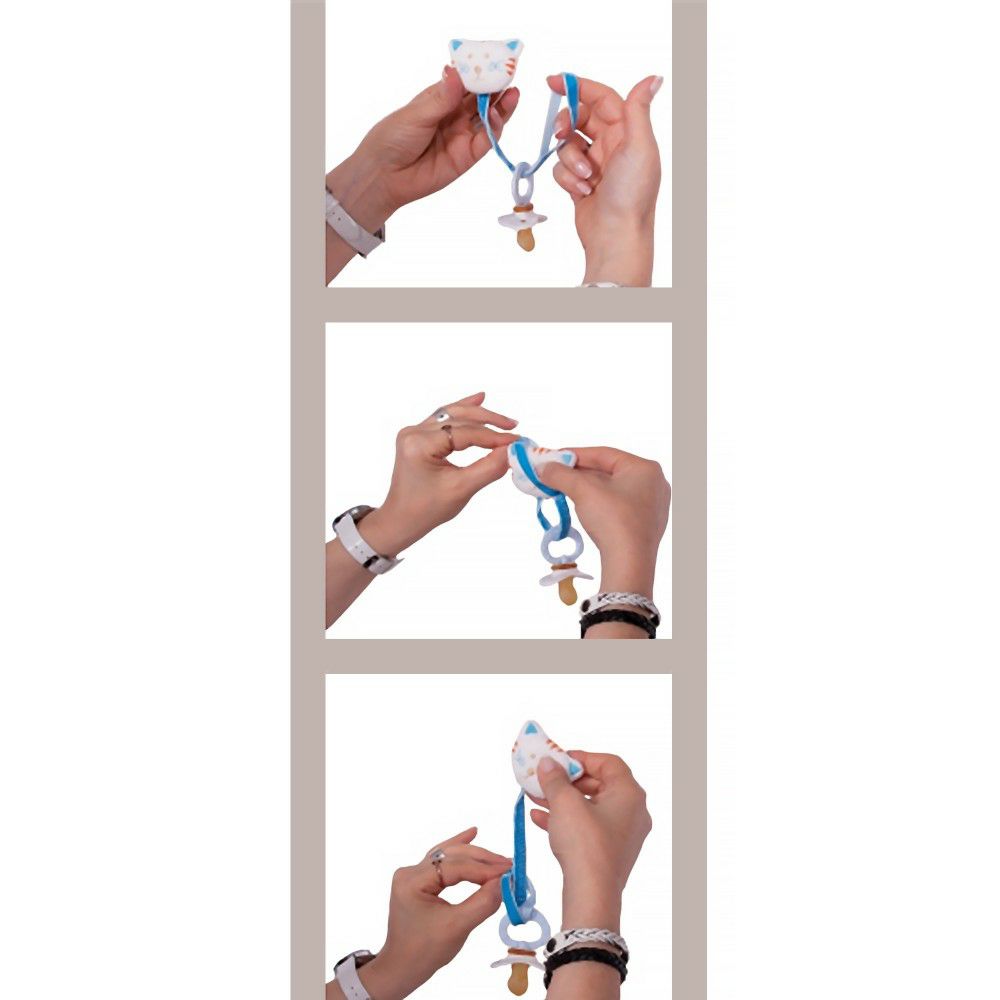 Животните фигури се закачени на штипката, а благодарение на оваа штипка, цуцлата лесно се прикачува на бебешката лигавче. На овој начин цуцлата не паѓа на подот и не се валка.